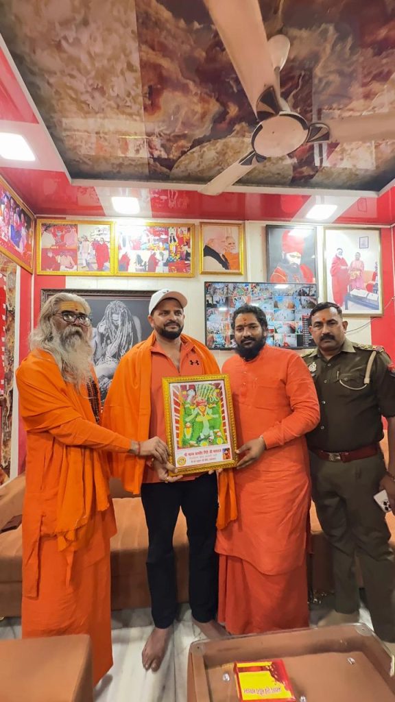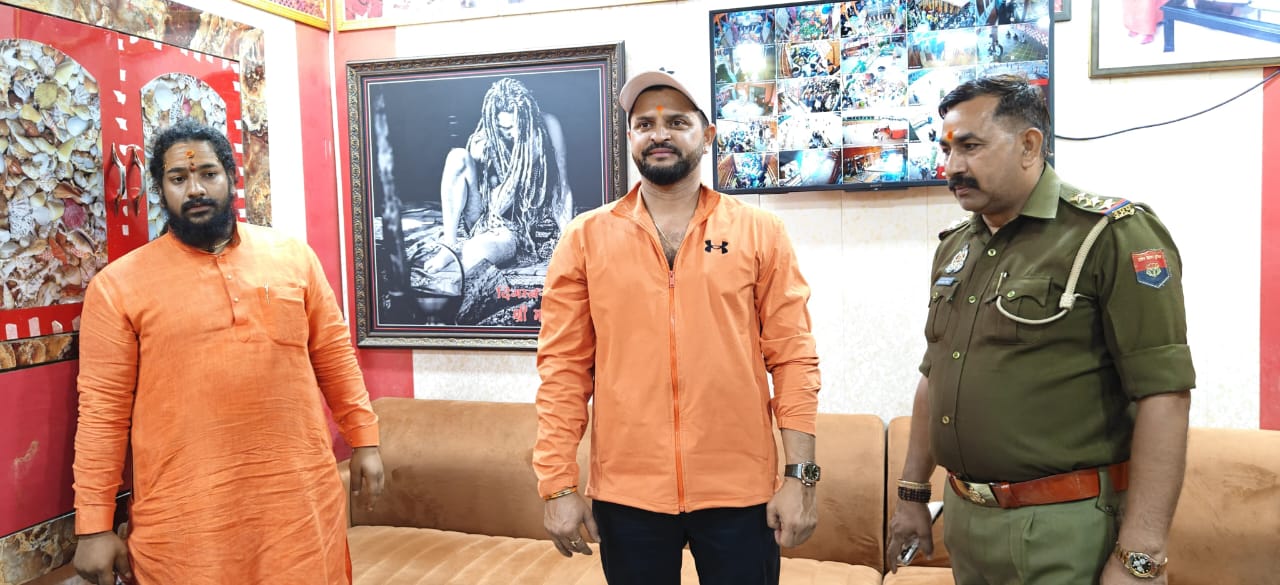 प्रयागराज। क्रिकेटर सुरेश रैना बंधवा स्थित बड़े हनुमान मंदिर पहुंचे। उनके सुरक्षा में थाना दारागंज प्रभारी ज्ञानेश्वर मिश्रा अपनी टीम के साथ उपस्थित रहे सुरेश रैना बजरंगबली महाराज का दर्शन कर पूजन किया। इसके बाद वह मठ बाघंबरी गद्दी भी गए। मठ में उन्होंने बाघंबरेश्वर महादेव के दर्शन कर गोशाला का भ्रमण किया और गो माता को गुड़ खिलाया। इसके बाद वह मठ बाघंबरी गद्दी भी गए। मठ में उन्होंने बाघंबरेश्वर महादेव के दर्शन कर गोशाला का भ्रमण किया और गो माता को गुड़ खिलाया। रैना ने बाघंबरी गद्दी के महंत बलबीर गिरि महाराज का भी आशीर्वाद प्राप्त किया। महंत ने उन्हें अंगवस्त्र, रुद्राक्ष की माला, हनुमान जी महाराज का फोटो संग प्रसाद भेंट किया।