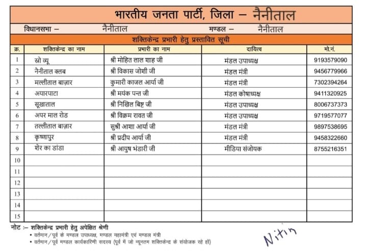 जिसमें मोहित शाह स्नो व्यू, विकास जोशी नैनीताल क्लब, काजल आर्य मल्लीताल बाजार, मयंक पंत आयरपाटा, निखिल बिष्ट सुखाताल विक्रम राठौर अपर माल रोड, आशा आर्य तल्लीताल बाजार, प्रदीप आर्य कृष्णापुर व आयुष भंडारी शेर का डांडा शक्ति केंद्र का प्रभारी बनाया गया। इस अवसर पर भाजपा कार्यकर्ताओं ने नियुक्त प्रभारियों को बधाई दी।