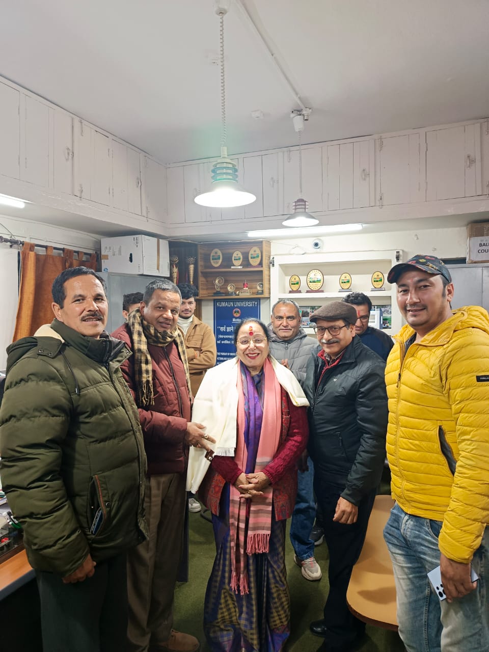 नैनीताल। सरोवर नगरी नैनीतालडी एस बी परिसर में अधिष्ठाता छात्र कल्याण कार्यालय में विधायक सरिता आर्य का भव्य स्वागत किया गया । विधायक को शॉल उड़ाकर सम्मानित किया गया । इस अवसर पर विधायक सरिता आर्य ने कैंपस में पानी की समस्या के स्थाई समाधान हेतु जल संस्थान के अधिकारी से फोन पर बात की तथा इस समस्या का निदान करने को कहा । विधायक ने गौर देवी हॉस्टल मार्ग के निर्माण हेतु भी हामी भरी है । इस अवसर पर डी एस डब्लू प्रॉफ संजय पंत ,निदेशक विजिटिंग प्रोफेसर डॉ ललित तिवारी ,प्रॉक्टर प्रॉफ हरीश बिष्ट ,नंदा बल्लभ पालीवाल ,चंद्र बल्लभ जोशी , हेमंत ,कुंदन ,अजय उपस्थित रहे ।