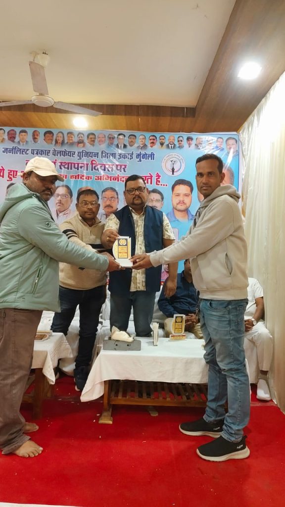 मुंगेली।- छत्तीसगढ़ जर्नलिस्ट वेलफेयर यूनियन, रायपुर की जिला इकाई मुंगेली के तत्वावधान में संगठन का सातवी स्थापना दिवस समारोह गरिमामय और वरिष्टों के मनाया गया। यह आयोजन दिनांक 9 दिसंबर 2025, मंगलवार को मुंगेली स्थित कस्तूरी होटल (कलेक्ट्रेट के पास) आयोजित किया गया, जिसमें जिले के कार्यक्रम की शुरुआत दीप प्रज्वलन एवं अतिथियों के स्वागत से हुई। आयोजन में मुख्य अतिथि के रूप में अनिल सोनी, अध्यक्ष प्रेस क्लब मुंगेली उपस्थित रहे। वहीं कार्यक्रम में अति विशिष्ट अतिथि के प्रभाकर पाण्डे, अपर जनसंपर्क अधिकारी सुजीत सिंह, तथा छत्तीसगढ़ जर्नलिस्ट वेलफेयर यूनियन के महासचिव कन्हैया गोयल की विशिष्ट उपस्थिति रही।कार्यक्रम की अध्यक्षता अमित गौतम (प्रदेश अध्यक्ष, छत्तीसगढ़ जर्नलिस्ट वेलफेयर यूनियन, रायपुर) ने की। संघ की गतिविधियों, उपलब्धियों एवं पत्रकार हित के संघर्षों पर विस्तार से प्रकाश डाला मुख्य अतिथि अनिल सोनी ने अपने उद्बोधन में कहां की हम सब पत्रकारों को हमारे पत्रकार अच्छी गरिमा हमेशा बचाए रखना है इस विषय पर सभी संगठन के पत्रकार आज एकत्रित हुए हैं वह खूबी मैं कहना चाहूंगा की हम सब एक हैं चेक को भी संगठन से रहे या कोई भी टीम से रहे हमारे मुंगेली जिले के पत्रकार एक दूसरे के लिए हमेशा एक्टिव रहते हैंप्रदेश अध्यक्ष अमित गौतम ने कहा कि प्रशासनिक अधिकार पत्रकारों को दिलाना हम सभी का संकल्प रहेगा प्रशासनिक अधिकारियों ने दिया मार्गदर्शन नवनीत पाटिल एसडीओपी ने पत्रकारों को शुभकामनाएं देते हुए कहा कि पत्रकार प्रशासन और जनता के बीच सेतु का कार्य करते हैं। पत्रकारों की सुरक्षा एवं सहयोग का आश्वासन देते हुए पत्रकारिता के महत्व पर प्रकाश डाला।बड़ी संख्या में मौजूद रहे पत्रकारविशिष्ट अतिथियों में रोहित शुक्ला (अध्यक्ष, नगर पालिका परिषद मुंगेली), जय प्रकाश मिश्रा (उपाध्यक्ष), योगेश शर्मा (सचिव, प्रेस क्लब मुंगेली), वरिष्ठ पत्रकार प्रमोद पाठक, जय ताम्रकार, सुशील शुक्ला, प्रीतम दिवाकर सुनील नार्गव उमेश दिवाकर बबलू बंजारे राकेश भास्कर गौरव तिवारी सहित जिले के अनेक पत्रकार बड़ी संख्या में उपस्थित रहे।सम्मान से अभिभूत बोले