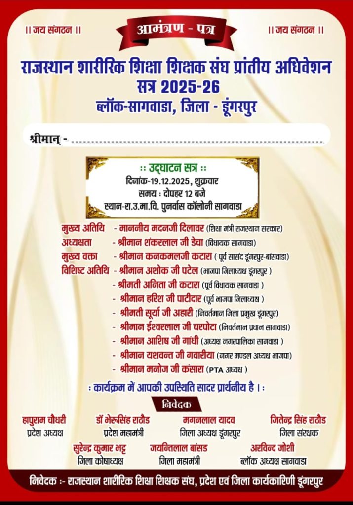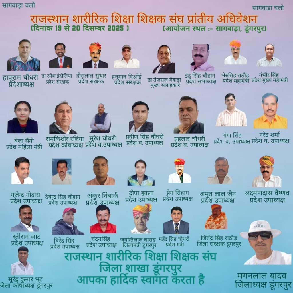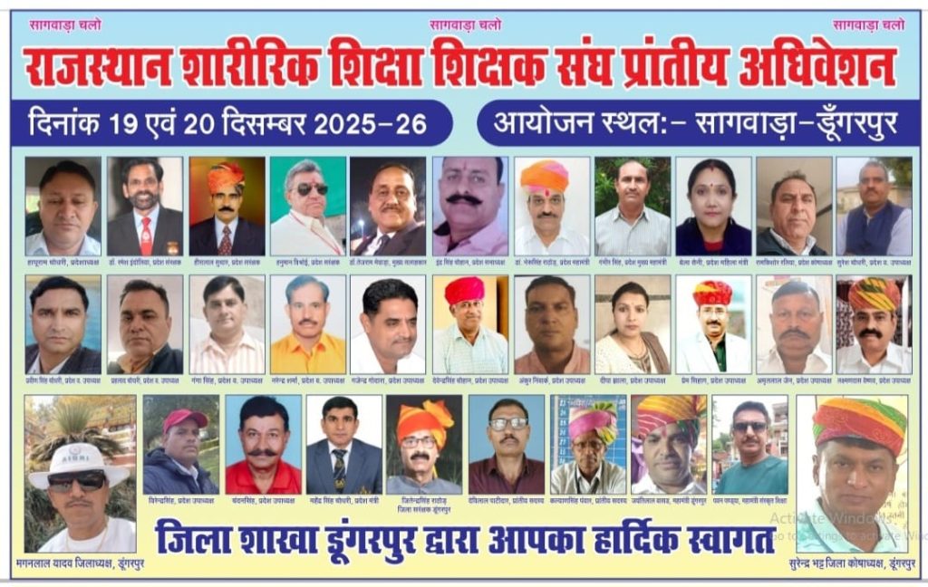 शारीरिक शिक्षा शिक्षक संघ का प्रांतीय अधिवेशन 19 व 20 दिसंबर को सागवाड़ा जिला डूंगरपुर में आयोजित होगा संघ के प्रदेशमहामंत्री डॉ. भेरू सिंह राठौड़ ने बताया कि अधिवेशन में मुख्य अतिथि शिक्षा मंत्री श्री मदन दिलावर व अन्य कई गणमान्य अतिथि होंगे साथ राजस्थान के सभी जिलों से शारीरिक शिक्षक भाग लेंगे अधिवेशन में दो दिनों तक विचार मंथन करेंगे।