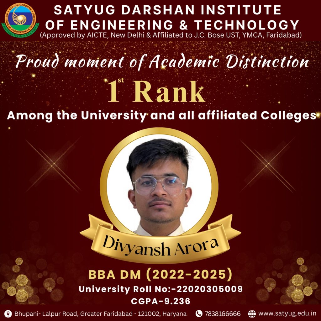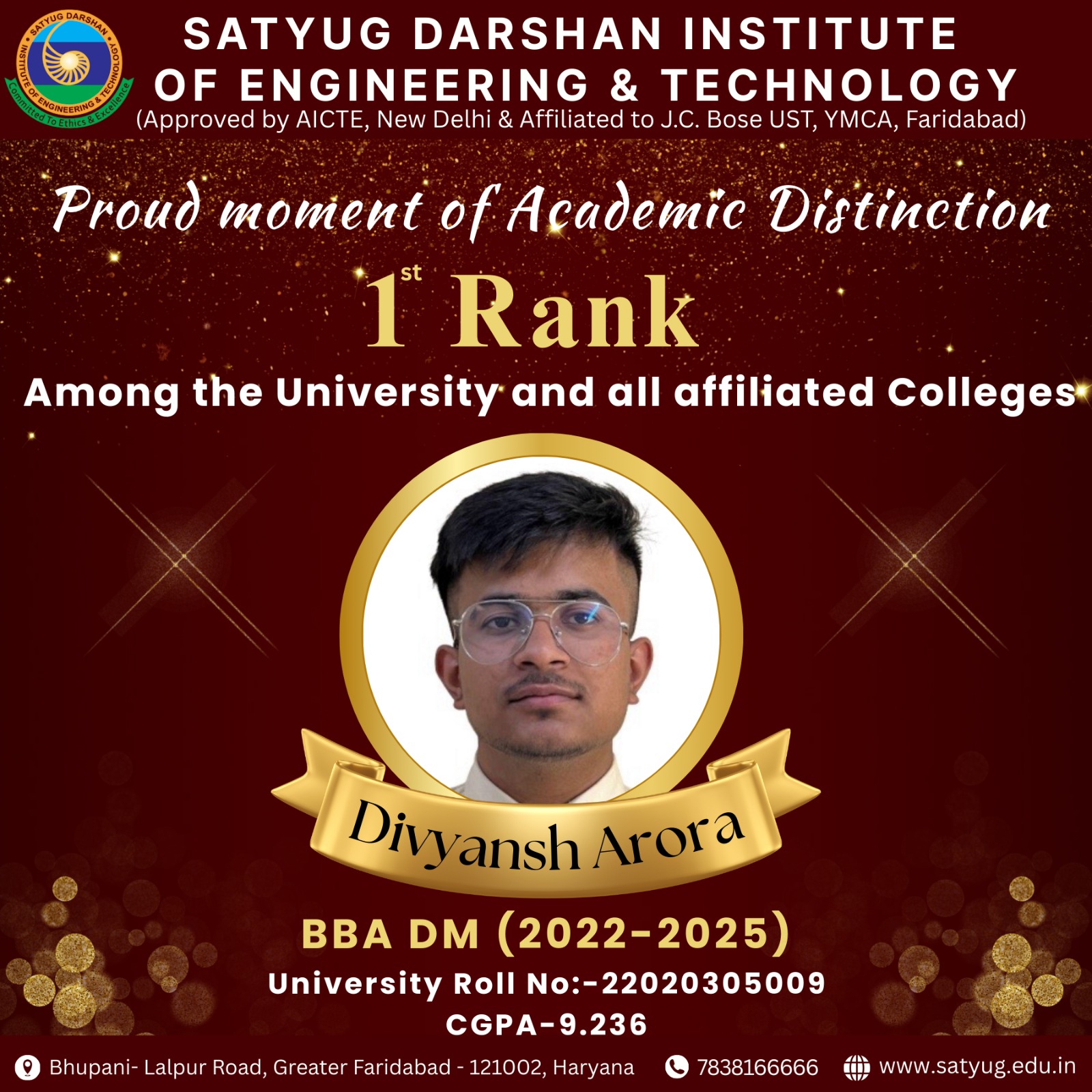 फरीदाबाद सत्युग दर्शन इंस्टीट्यूट ऑफ इंजीनियरिंग एंड टेक्नोलॉजी (SDIET), फरीदाबाद को यह घोषणा करते हुए अत्यंत गर्व हो रहा है कि संस्थान के बीबीए – डिजिटल मार्केटिंग (सत्र 2022–2025) के छात्र दिव्यांश अरोड़ा ने विश्वविद्यालय एवं उससे संबद्ध सभी महाविद्यालयों में प्रथम स्थान प्राप्त कर एक ऐतिहासिक उपलब्धि हासिल की है। उन्होंने 9.236 की उत्कृष्ट सीजीपीए के साथ यह गौरवपूर्ण सफलता अर्जित की। यह उपलब्धि न केवल दिव्यांश अरोड़ा की निरंतर मेहनत, अनुशासन और शैक्षणिक उत्कृष्टता को दर्शाती है, बल्कि सत्युग दर्शन इंस्टीट्यूट ऑफ इंजीनियरिंग एंड टेक्नोलॉजी की मजबूत अकादमिक संस्कृति, गुणवत्तापूर्ण शिक्षण व्यवस्था और छात्र-केंद्रित दृष्टिकोण को भी प्रतिबिंबित करती है।