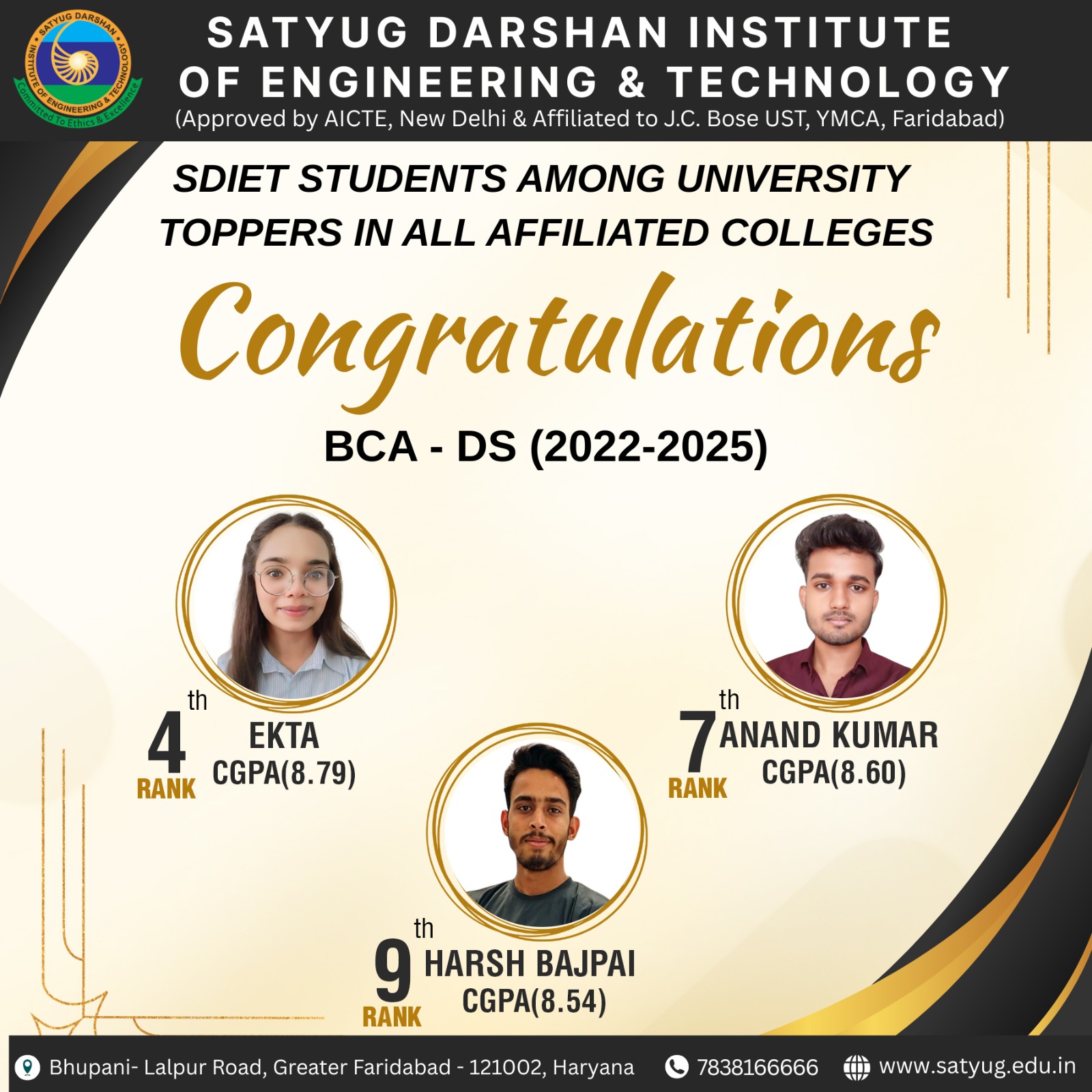 फरीदाबाद सत्युग दर्शन इंस्टीट्यूट ऑफ इंजीनियरिंग एंड टेक्नोलॉजी (एसडीआईईटी) के लिए यह अत्यंत गर्व का क्षण है कि बीसीए – डेटा साइंस (2022–2025) कार्यक्रम के विद्यार्थियों ने विश्वविद्यालय एवं उससे संबद्ध सभी महाविद्यालयों में शीर्ष रैंक प्राप्त कर संस्थान का नाम रोशन किया है। संस्थान एक्ता, आनंद कुमार एवं हर्ष बाजपेयी को उनके उत्कृष्ट शैक्षणिक प्रदर्शन, निरंतर परिश्रम एवं समर्पण के लिए हार्दिक बधाई एवं शुभकामनाएँ देता है। यह उपलब्धि न केवल विद्यार्थियों की व्यक्तिगत मेधा को दर्शाती है, बल्कि एसडीआईईटी की सशक्त अकादमिक संस्कृति, विद्यार्थी-केंद्रित शिक्षण प्रणाली एवं परिणामोन्मुखी दृष्टिकोण को भी प्रतिबिंबित करती है।