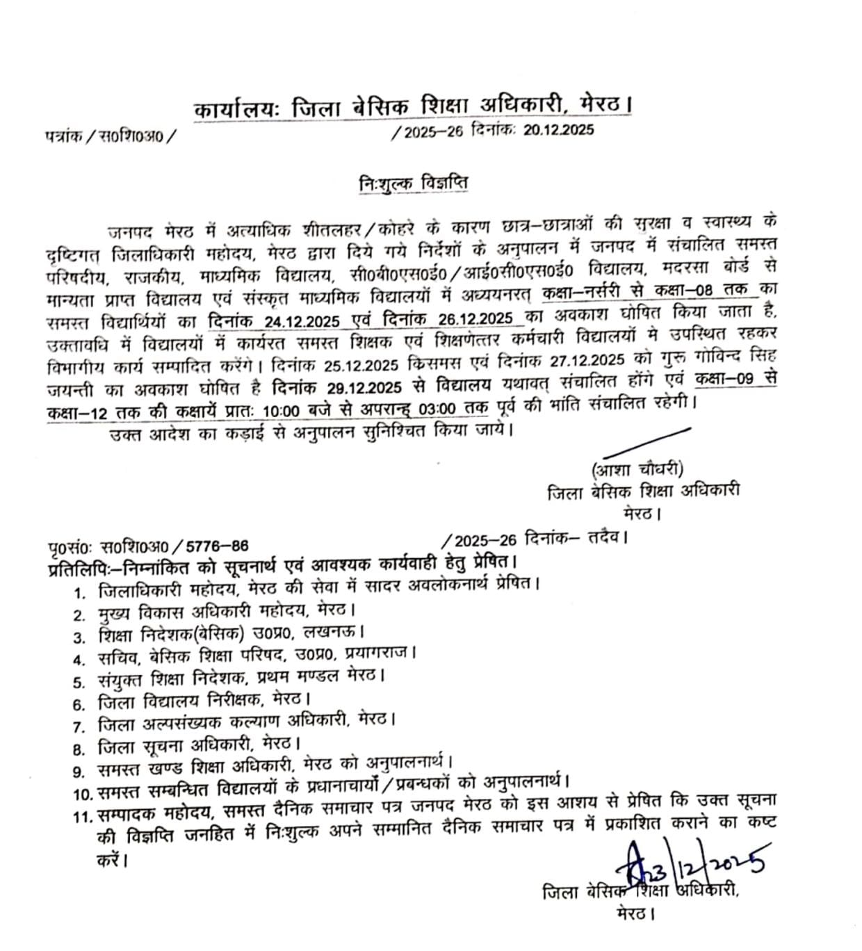 आदेश जिला बेसिक शिक्षा अधिकारी मेरठ द्वारा जारी