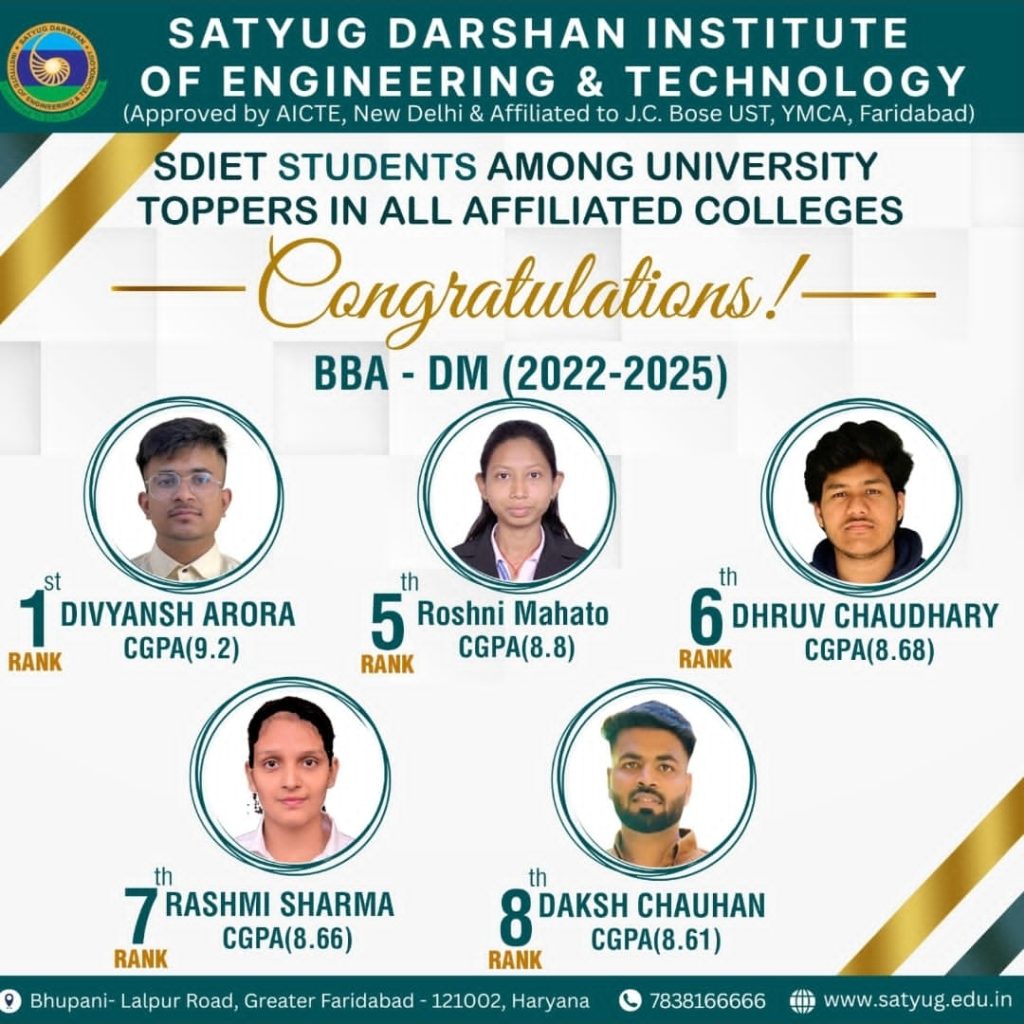 फरीदाबाद सत्युग दर्शन इंस्टीट्यूट ऑफ इंजीनियरिंग एंड टेक्नोलॉजी (एसडीआईईटी), फरीदाबाद के लिए यह अत्यंत गर्व का अवसर है कि बीबीए–डिजिटल मार्केटिंग (2022–2025) कार्यक्रम के विद्यार्थियों ने जे.सी. बोस यूनिवर्सिटी ऑफ साइंस एंड टेक्नोलॉजी, YMCA, फरीदाबाद से संबद्ध सभी कॉलेजों में विश्वविद्यालय टॉपर्स की सूची में उल्लेखनीय स्थान प्राप्त कर संस्थान का नाम गौरवान्वित किया है। विद्यार्थियों का यह उत्कृष्ट प्रदर्शन उनकी अनुशासनशीलता, निरंतर परिश्रम और उच्च स्तरीय अकादमिक एकाग्रता का प्रमाण है, जो एसडीआईईटी में विकसित की गई सशक्त शैक्षणिक संस्कृति और गुणवत्तापूर्ण मार्गदर्शन का प्रतिफल है।