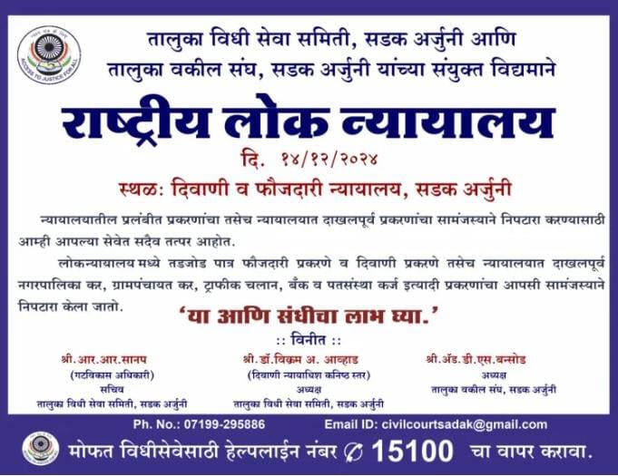 सड़क अर्जुनी(गोंदिया) : माननीय. बॉम्बे हाई कोर्ट और महाराष्ट्र राज्य कानूनी सेवा प्राधिकरण के निर्देश के तहत, जिला कानूनी सेवा प्राधिकरण, तालुका कानूनी सेवा समिति सड़क अर्जुनी और वकील संघ ने 14 दिसंबर को सड़क अर्जुनी कोर्ट में एक राष्ट्रीय लोक अदालत का आयोजन किया। राष्ट्रीय लोक अदालत लंबित मामलों के शीघ्र निपटान और पक्षों के बीच सौहार्दपूर्ण संबंध बनाए रखने का एक बहुत ही प्रभावी साधन है। इस राष्ट्रीय लोक अदालत में नागरिक दावों, समझौता योग्य आपराधिक मामलों, पारिवारिक उत्पीड़न से महिलाओं की सुरक्षा अधिनियम, 2005 के तहत आवेदनों की जांच की जाती है। बाउंस मामले, बैंक ऋण वसूली मामले, और पूर्व प्रवेश मामलों में, बिजली कर, जल कर, बिजली बिल के भुगतान, वैवाहिक विवाद से संबंधित मामले मामले, राजस्व मामले आदि सारांश अपराधों में अपराध स्वीकार होने पर न्यूनतम दंड के साथ त्वरित गति से मामलों का निपटारा करने के लिए सड़क अर्जुनी न्यायालय में चतुर्थ राष्ट्रीय लोक अदालत का आयोजन किया गया है। लोक अदालतों में निपटाए गए मामलों के खिलाफ अपील नहीं की जा सकती और अदालती फीस नहीं ली जाती। अत: अधिक से अधिक नागरिक 14 दिसम्बर 2024 को आयोजित चतुर्थ राष्ट्रीय लोक अदालत में उपस्थित होकर इस सुनहरे अवसर का लाभ उठायें तथा अपना कीमती समय एवं धन बचायें, अधिक जानकारी के लिए जिला विधिक सेवा प्राधिकरण गोदिया अथवा सड़क अर्जुनी स्थित तालुका विधिक सेवा समिति से सम्पर्क करें। अर्जुनी अपील न्यायाधीश डाॅ. विक्रम सं. आव्हाड ने किया है.
