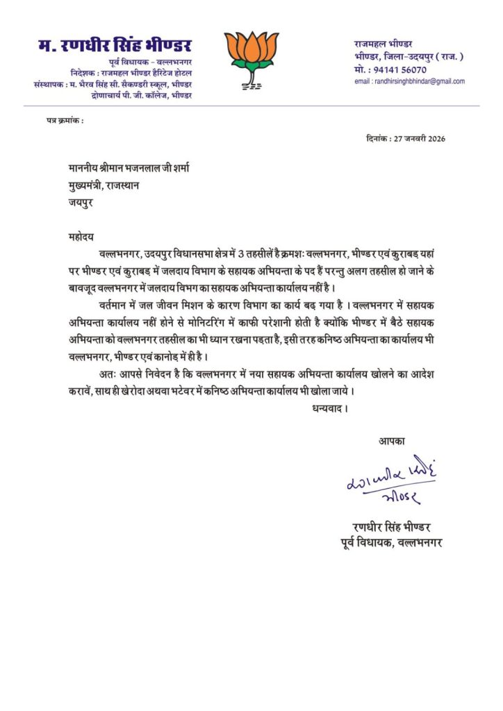 उदयपुर। वल्लभनगर विधानसभा क्षेत्र के पूर्व विधायक एवं भाजपा नेता रणधीर सिंह भीण्डर ने मुख्यमंत्री भजनलाल शर्मा को पत्र लिखकर वल्लभनगर में जलदाय विभाग का नया सहायक अभियंता कार्यालय खोलने की मांग की है।