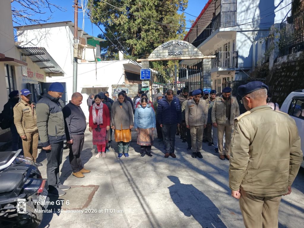 नैनीताल। सरोवर नगरी नैनीताल समेत पूरे जनपद में एसएसपी डॉ० मंजूनाथ टी०सी०, के निर्देशन में नैनीताल पुलिस द्वारा शहीद स्मृति दिवस के अवसर पर भारत के स्वतंत्रता संग्राम में अपने जीवन का बलिदान देने वाले महान सेनानियों एवं शहीदों को दो मिनट मौन धारण कर श्रदांजलि अर्पित की।