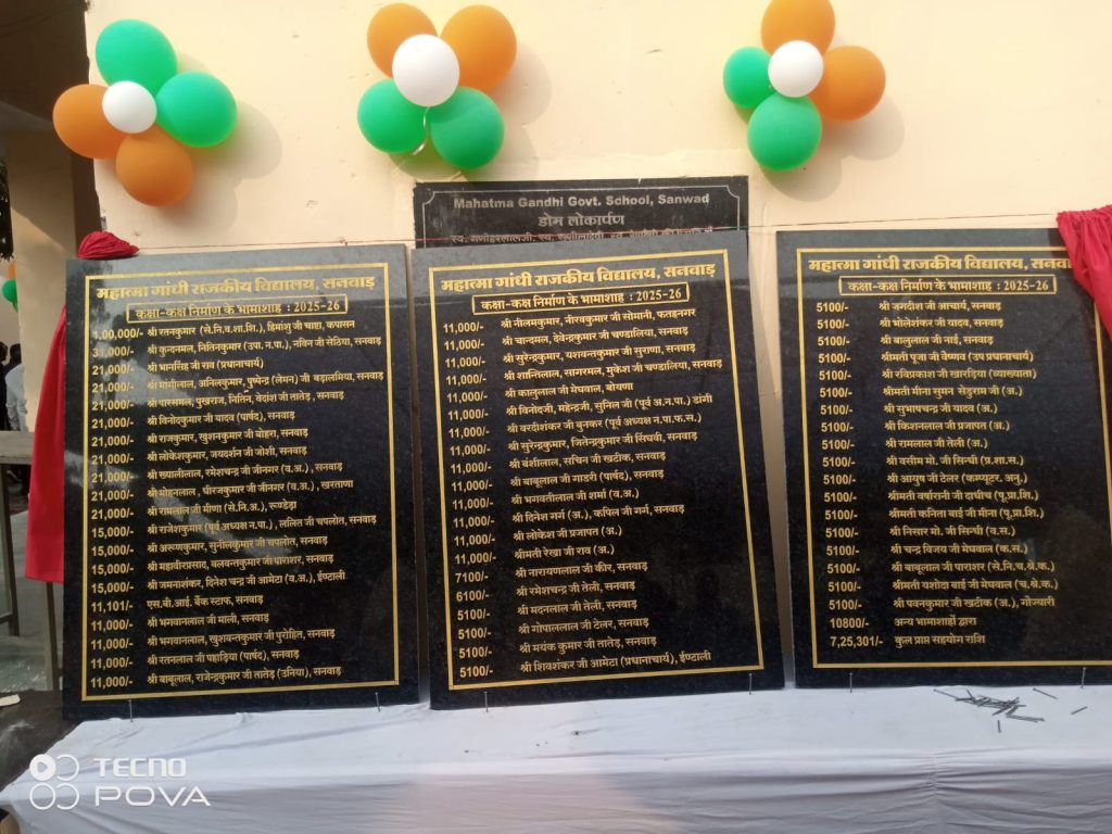 ग्यारह हजार एक सौ एक रूपये एस बी आई बैंक सनवाड़ स्टाफ द्वारा, अट्ठारह परिवारों द्वारा प्रति परिवार ग्यारह हज़ार रुपये भगवान लाल माली, भगवान लाल खुशवंत कुमार पुरोहित, रतन लाल पहाड़िया, बाबु लाल राजेन्द्र कुमार तांतेड़, नीलम कुमार सोमानी, चांदमल देवेन्द्र कुमार चंडालिया, सुरेन्द्र कुमार यशवंत कुमार सुराणा, शांति लाल सागरमल मुकेश चंडालिया, कालु लाल मेघवाल बोयणा, विनोद महेंद्र सुनील डांगी, वरदी शंकर बुनकर, सुरेन्द्र कुमार जितेंद्र कुमार सिंघवी, बंशी लाल सचिन खटीक, बाबु लाल गाडरी, भगवती लाल शर्मा, दिनेश गर्ग कपिल गर्ग,