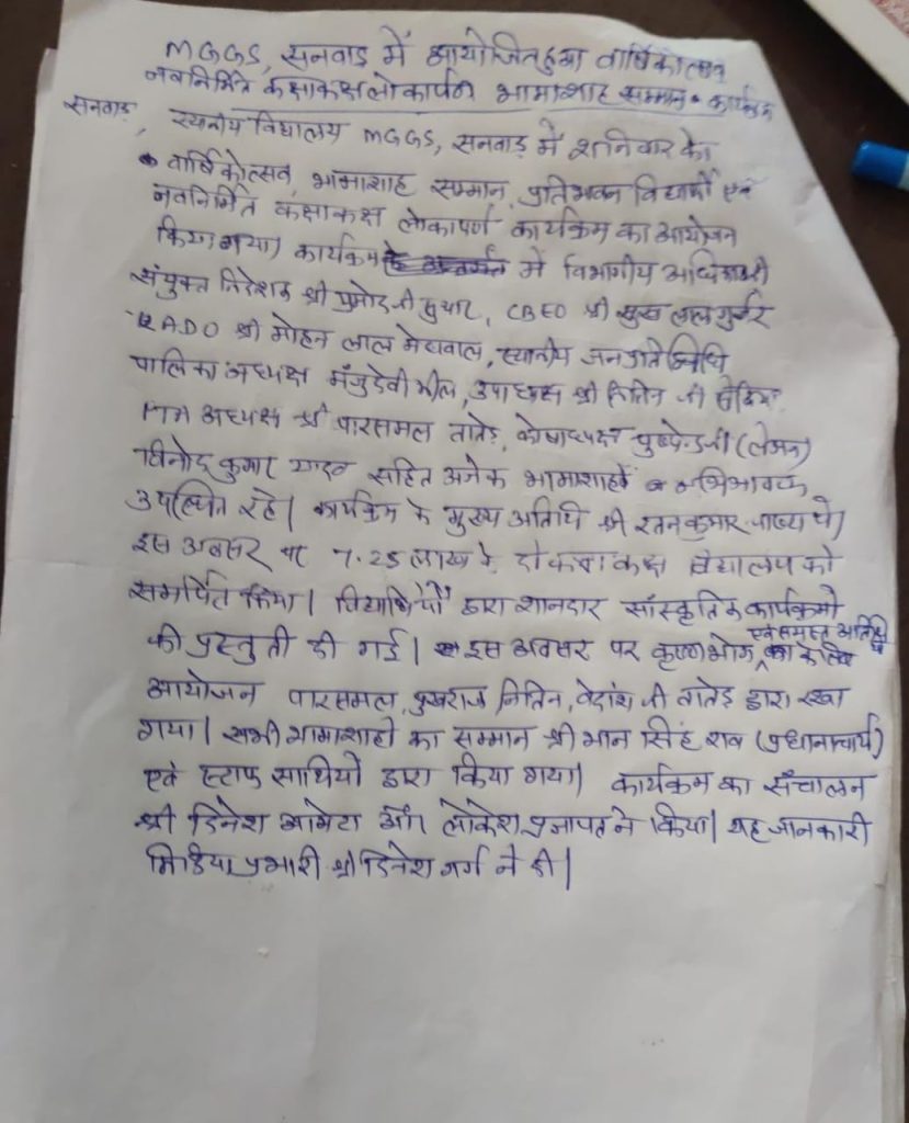 मावली उपखण्ड के नगर पालिका फतहनगर- सनवाड़ क्षेत्र में संचालित राजकीय महात्मा गॉंधी विद्यालय सनवाड़ में शनिवार को भामाशाह सम्मान, प्रतिभाओं का सम्मान, वार्षिकोत्सव एवं नवनिर्मित कक्षा कक्ष का लोकार्पण किया गया।