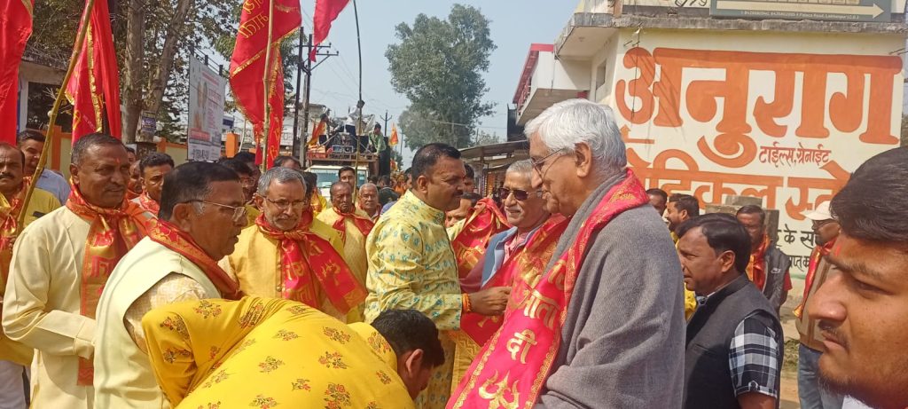 प्राचीन स्वयं-भू- शिवमन्दिर में नवनिर्मित दूर्गा मंदिर में शक्ति स्वरूपा मां दूर्गा के प्रतिमा स्थापना प्राण प्रतिष्ठा को लेकर 4 फरवरी 26 बुधवार को वेदी रचना 5 फरवरी दिन गुरुवार को प्राचीन महामाया मंदिर से दिन के 10 बजे गाजे बाजे के साथ कलश यात्रा निकाली गई। इस कलश यात्रा में केबिनेट मंत्री छत्तीसगढ़ शासन राजेश अग्रवाल पूर्व उप मुख्यमंत्री टी0एस0 सिंह देव विक्रमादित्य सिंह देव, अमित सिंह देव,कृपा गुप्ता,रामनाथ गुप्ता कपूर गुप्ता जितेन्द्र गुप्ता दिनेश गुप्ता, मनोज गुप्ता होरी लाल गुप्ता संजय गुप्ता नगर वासी पंडित पुजारी तथा माता भक्त काफी संख्या में शामिल हुये। कलश यात्रा नगर के विभिन्न गलियों से गुजरते हुए शिव मंदिर प्रांगण पहुंची जहां वेदी पूजन जलादिवस धार्मिक आयोजन सम्पन्न हुई उपस्थित जनसमूह को प्रसाद वितरित किया गया। मूर्ति प्राण प्रतिष्ठा को लेकर बनाये कार्यक्रम के अनुसार 6 फरवरी दिन शुक्रवार को पूजन एवं अन्ना दिवस 7 फरवरी दिन शनिवार 1 बजे शिवमन्दिर प्रांगण से माता रानी के प्रतिक चिन्ह के साथ नगर भ्रमण पूजन फला व शय्या दिवस 8 फरवरी 2026दिन रविवार को देवी प्राण प्रतिष्ठा देवी श्रृंगार हवन पूर्णाहुति कन्या भोज सभी आयोजन सुबह 8 बजे से शुरू होगी। इस आयोजन से नगर में भक्ति मय वातावरण निर्मित है।