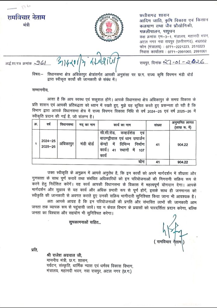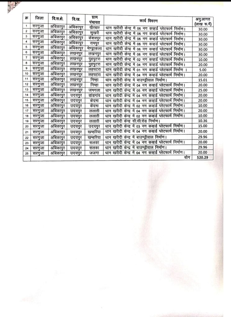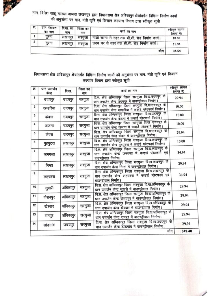 छत्तीसगढ़ के कैबिनेट मंत्री राजेश अग्रवाल की अनुशंसा पर अंबिकापुर विधानसभा क्षेत्र अंतर्गत छत्तीसगढ़ राज्य कृषि विपणन मंडी बोर्ड द्वारा 904.22 लाख की लागत से सीसी सड़क कवहर्ड शेड,बाउंड्री वॉल ,धान उपार्जन केंद्रों में विभिन्न निर्माण कार्य 41 स्थान में 107 कार्यों की स्वीकृति प्रदान की गई है।ग्राम तुरना में माझी सरना से नहर तक सीसी रोड 18.60लाख,उदय घर से नहर तक सीसी सड़क निर्माण 15.94 लाख,ग्राम पुहपुटरा धान उपार्जन केंद्र में कवहर्ड प्लेटफार्म निर्माण 10 लाख, जमगला धान उपार्जन केंद्र में कवहर्ड प्लेटफार्म एवं बाउंड्री वॉल निर्माण 34.94 लाख निमहा धान उपार्जन केंद्र में बाउंड्री वॉल 29.94 लहपटरा धान उपार्जन केंद्र में कवहर्ड प्लेटफार्म एवं बाउंड्री वॉल निर्माण 34.94, उदयपुर धान उपार्जन केंद्र में बाउंड्री वॉल 29.94 ,खमरिया धान उपार्जन केंद्र में कवहर्ड प्लेटफार्म निर्माण 10 लाख , केंदमा धान उपार्जन केंद्र में कवर्ड प्लेटफार्म निर्माण 10 लाख, जजगा धान उपार्जन केंद्र में कवर्ड प्लेटफार्म निर्माण 10 लाख, केवरा धान उपार्जन केंद्र में बाउंड्री वॉल 29.94 लाख, सुखरी धन उपार्जन केंद्र में बाउंड्री वॉल निर्माण 29.94 केशवपुर धान खरीदी केंद्र में बाउंड्री वॉल निर्माण 29.94 खैरबार धान उपार्जन केंद्र में बाउंड्री वॉल 29.94, रामपुर धन उपार्जन केंद्र में बाउंड्री वॉल 29.94 डांडगांव धान उपार्जन केंद्र में बाउंड्री वॉल 29.94 खैर बार धान उपार्जन केंद्र में 6 नग कवर्ड प्लेटफार्म निर्माण 30 लाख, सुखरी धान उपार्जन केंद्र में 6नग कवर्ड प्लेटफार्म निर्माण 30 लाख, रामपुर धान खरीदी केंद्र में 6 नग कवर्ड प्लेटफार्म निर्माण 30 लाख, लखनपुर धान खरीदी केंद्र में 6 नग कवर्ड प्लेटफार्म निर्माण 30 लाख, पुहपुटरा धान खरीदी केंद्र में 2 नग काव्हड प्लेटफार्म 10 लाख पुहपुटरा धान खरीदी केंद्र में 4 नग कवर्ड प्लेटफार्म निर्माण 20 लाख लहपटरा धान खरीदी केंद्र में कवर्ड प्लेटफार्म निर्माण 5 लाख , लहपटरा धन उपार्जन केंद्र में 4 नग कवर्ड प्लेटफार्म निर्माण 20 लाख, निमहा धान खरीदी केंद्र में बाउंड्री वॉल निर्माण 15 लाख निमहा धान उपार्जन केंद्र में चार लाख कवहट प्लेटफार्म निर्माण 20 लाख ,जमगला धान खरीदी केंद्र में 5 नग कवहर्ड प्लेटफार्म निर्माण 25 लाख डांडगांव धान खरीदी केंद्र में 4 नग कवहर्ड प्लेटफार्म निर्माण 20 लाख के खरीदी केंद्र में 4 नग कवर्ड प्लेटफार्म निर्माण 20 लाख केदमा धान खरीदी केंद्र में 2 नग कवहर्ड प्लेटफार्म निर्माण 10 लाख, लालती धान खरीदी केंद्र में चार नग कवहट प्लेटफार्म निर्माण 20 लाख, ललाती धान खरीदी केंद्र में दो नग कवर्ड प्लेटफार्म निर्माण 10 लाख, लालती धान खरीदी केंद्र सीसी रोड निर्माण 10.36 उदयपुर धान खरीदी केंद्र में तीन नग कवहड़ प्लेटफार्म निर्माण 15 ल