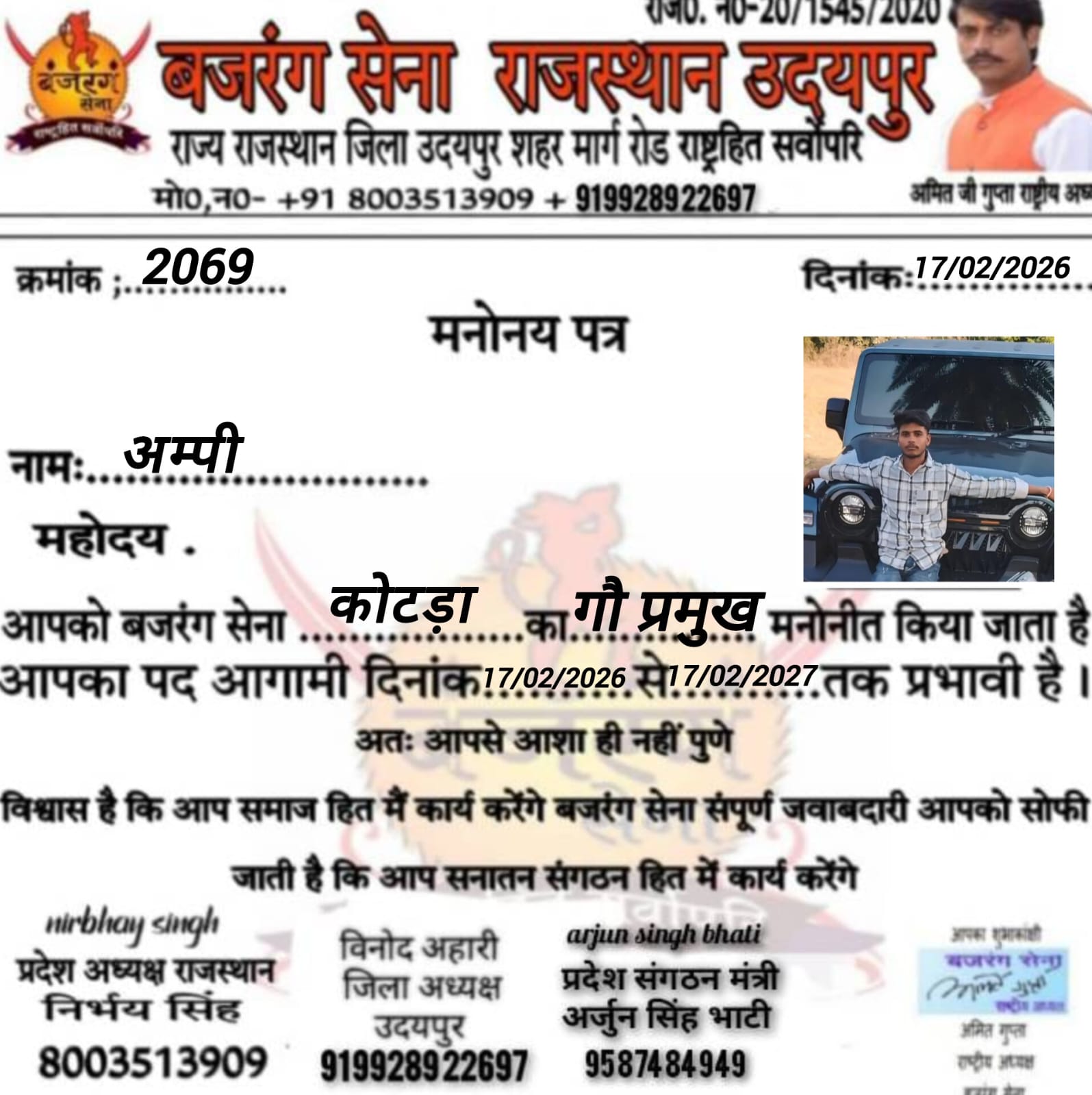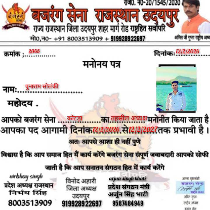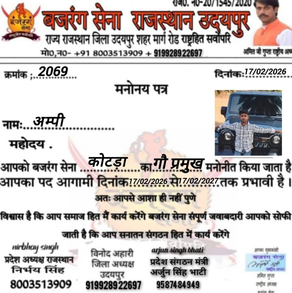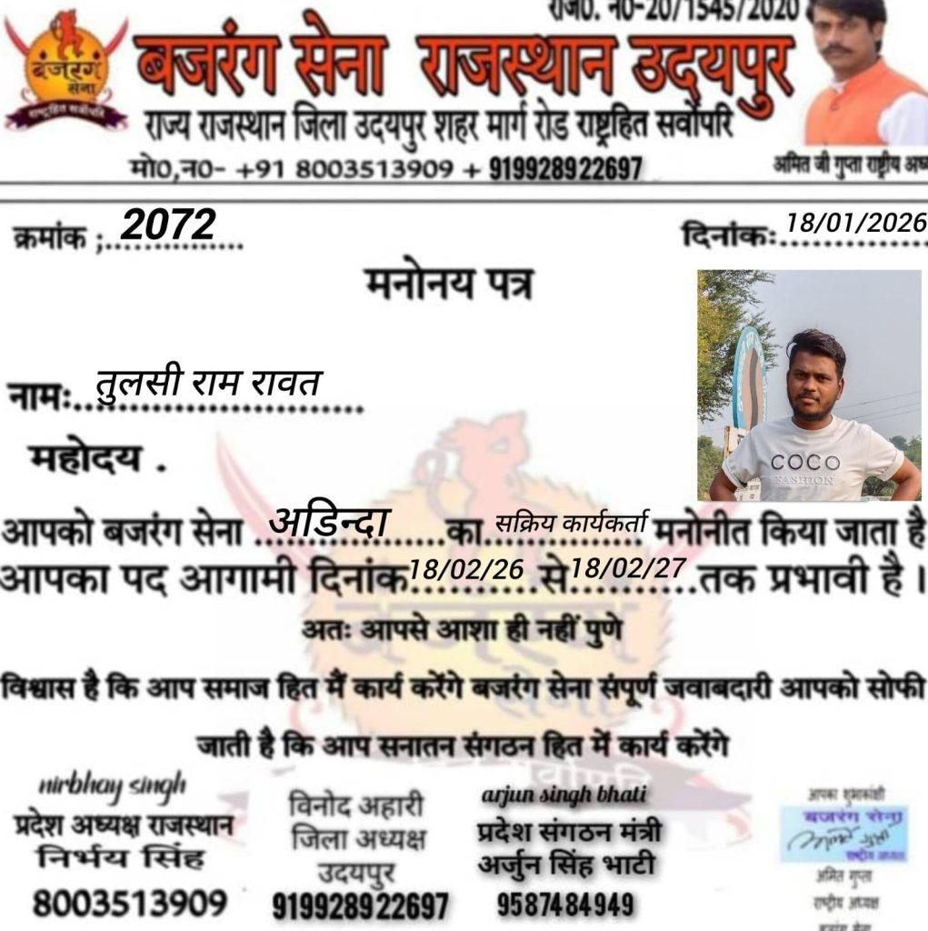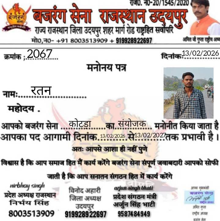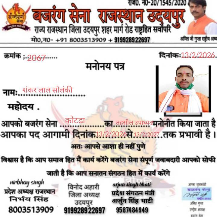 बजरंग सैना के राष्ट्रीय अध्यक्ष अमित गुप्ता, राजस्थान प्रदेशा अध्यक्ष निर्भय सिंह , उदयपूर जीला अध्यक्ष विनोद अहारी निर्देशानुसार तुलसी राम रावत को अडिन्दा का सक्रिय कार्यकर्ता मनोनित किया सुंदर लाल खैर को उदयपूर का जीला संयोजक मनोनित किया रतन को कोटड़ा संयोजक , शंकर लाल सोलंकी को कोटड़ा तहसील उपाध्यक्ष , पुनाराम सोलंकी को कोटड़ा तहसील अध्यक्ष कालूराम रावत को अडिन्दा का गौ प्रमुख मनोनीत किया | मौके पर राजमल वेद अडिन्दा तहसिल अध्यक्ष , एडवोकेट किशन लाल रावत, देवीलाल समाज सैवी , रूप लाल , देवी सिंह सहित कार्यकर्ता उपस्थित थे |