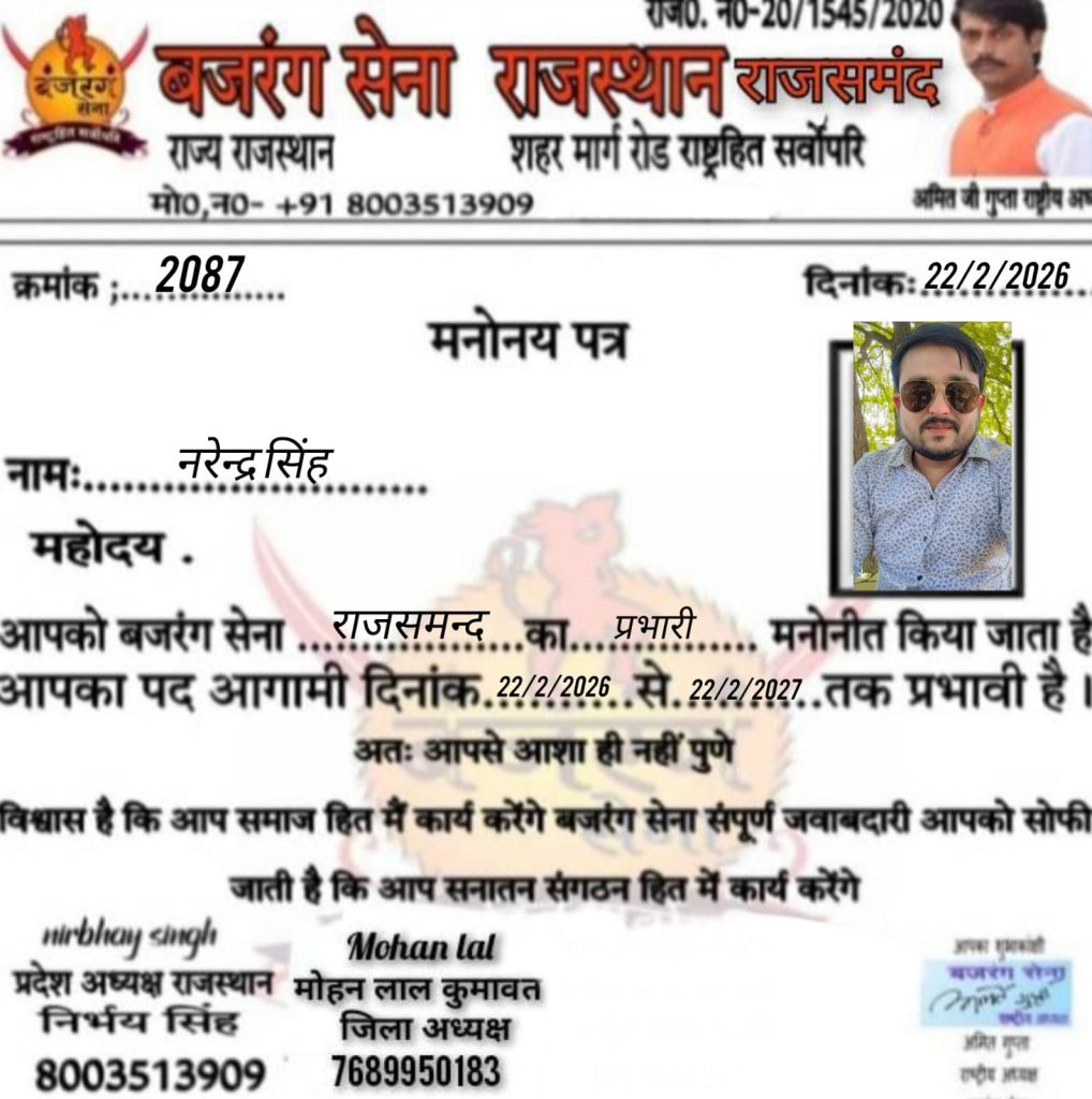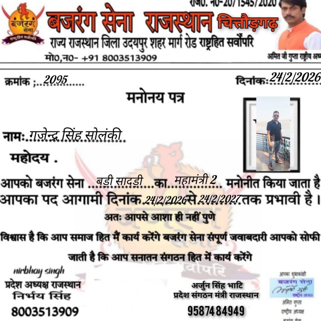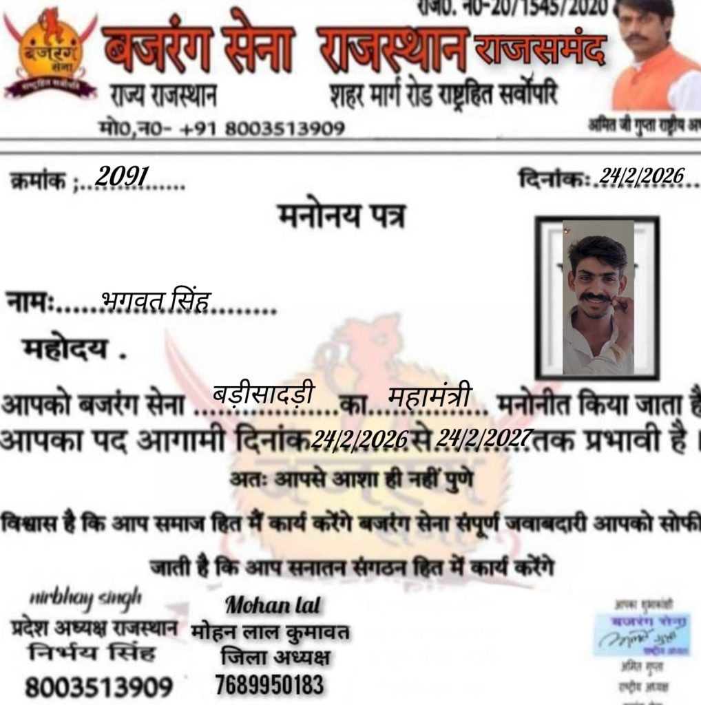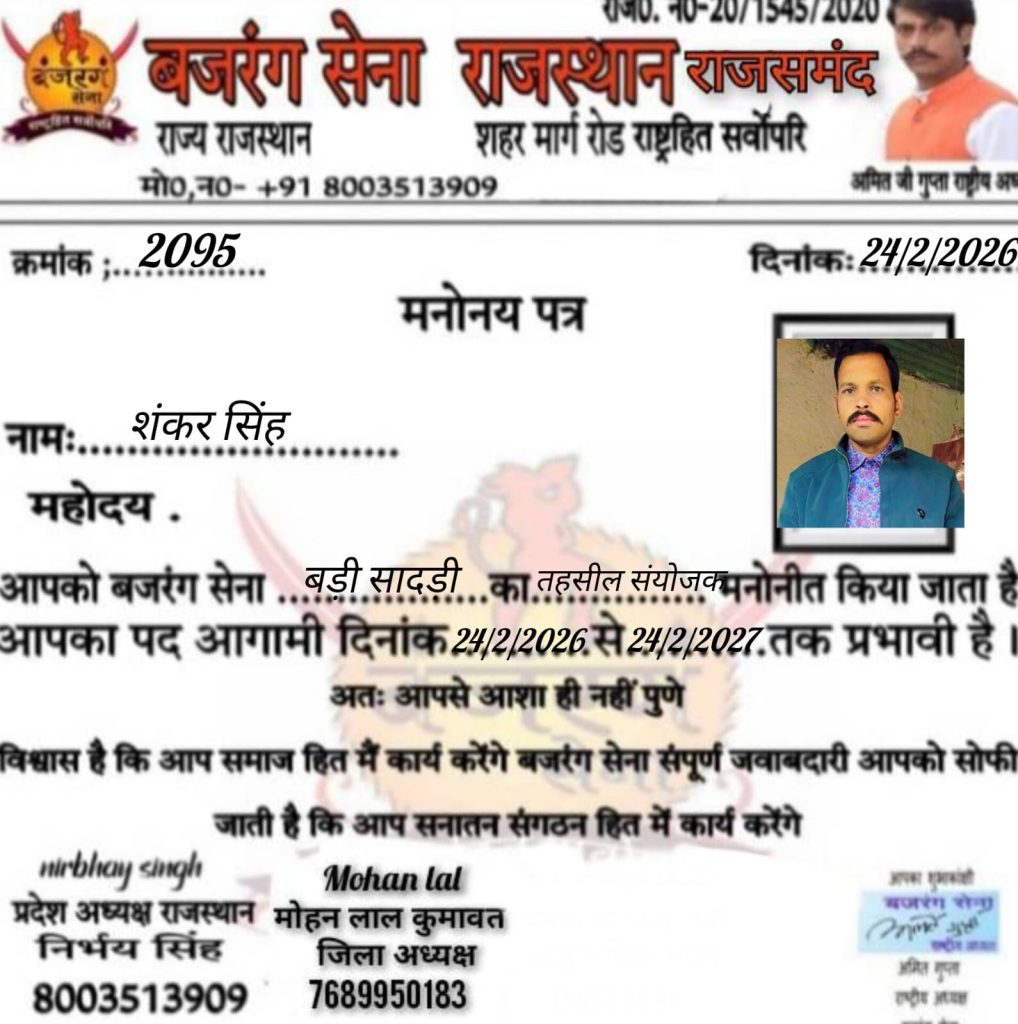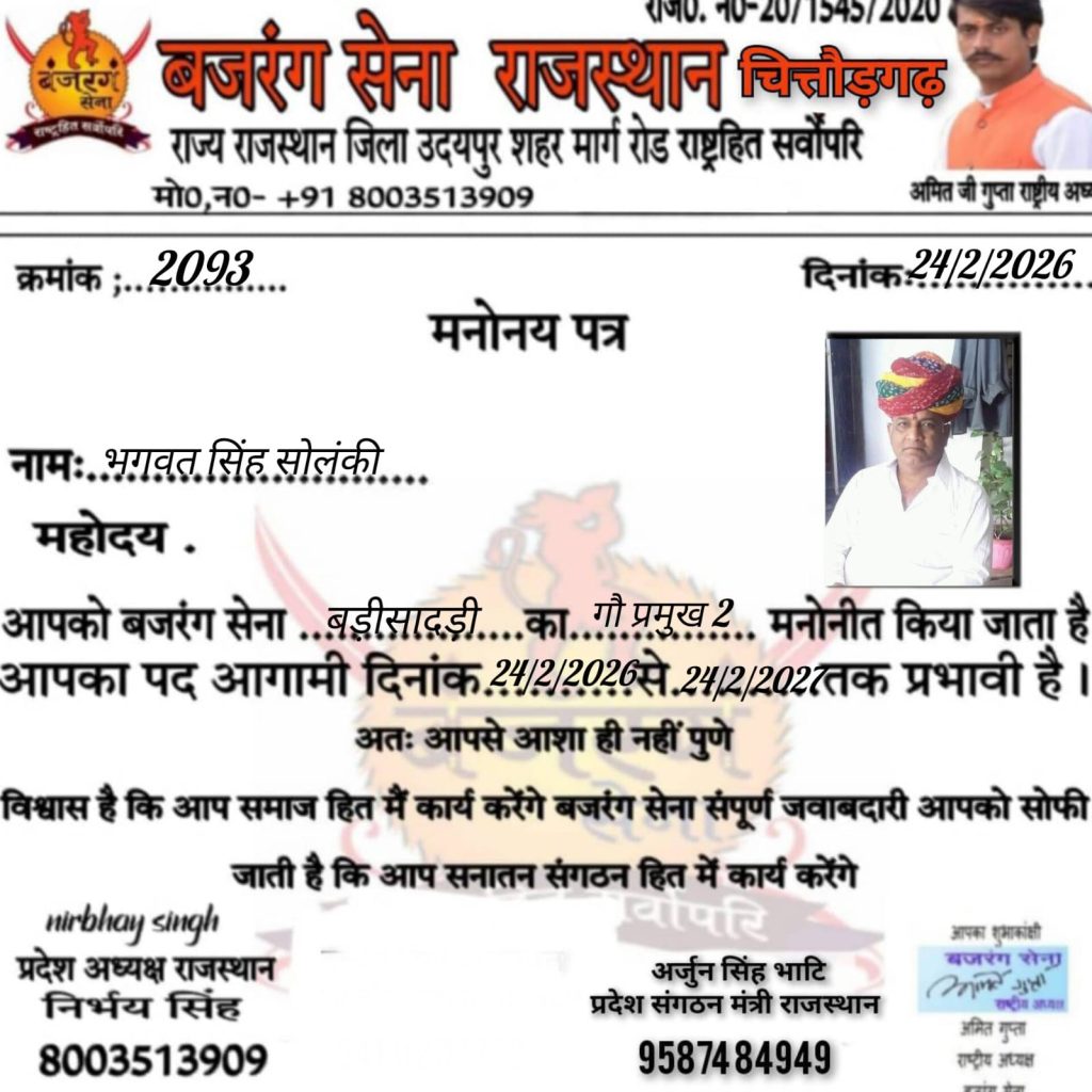 बजरंग सेना के राष्ट्रीय अध्यक्ष अमित गुप्ता निर्भय सिंह राजस्थान प्रदेशाध्यक्ष बड़ीसादड़ी तहसील अध्यक्ष राहुल दास वेष्णव के निर्देशन में रमेश दास वेष्णव को गौ प्रमुख भगवत सिंह को महामंत्री कन्हैया दास वेष्णव को संगठन मंत्री एवं शंकर सिंह को तहसील संयोजक मनोनीत किया मोके पर प्रभारी पुष्पेन्द्र सिंह सोलंकी कुलदीप सालवी तहसील उपाध्यक्ष हरी सिंह सोलंकी समाज सेवी देवी लाल तराल समाज सेवी कोटड़ा क्रांति लाल संगठन मंत्री कोटड़ा प्रवीण सचिव एडवोकेट किशन लाल मीणा तहसील अध्यक्ष भींडर नारायण लाल राजमल वेद मोहन लाल कुमावत जिला अध्यक्ष राजसमंद नरेन्द्र सिंह जिला प्रभारी राजसमन्द आदि कार्यकर्ता उपस्थित थे बेठक मे गौ माता को राष्ट्र माता गौषित किया जाए एवं कार्यकर्ता कड़ी से कड़ी जोड़े और संगठन के प्रति जागरूक होवे।