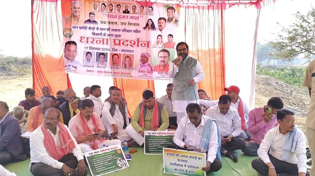 धान लेने में देरी और पुरा राशि नहीं देंगे तो भाजपा के लोग मंत्री ही नहीं गांव के चुनाव भी नहीं जीत पाएंगे -किसान प्रदेश कांग्रेस अध्यक्ष दीपक बैज के निर्देश पर जिला कांग्रेस एवं ब्लॉक कांग्रेस के अगुवाई में डोंगरगढ़ ग्रामीण ब्लॉक कसारी (रुवातला) सोसाइटीे पास धरना प्रदर्शन हुई जिसमें कार्यक्रम की शुरुआत महात्मा गांधी के तैलचित्र पर पुष्प हार तिलक लगाकर उन्हें नमन किया गया फिर उपस्थित क्षेत्र के किसानों को बोलने का मौका दिया गया जीस पर एक किसान ने कहा कि जो अभी की स्थिति है किसानो को जो परेशानी हो रही है उसमें भाजपा के लोग मंत्री तो बनना बहुत दूर की बात है गांव में पंच सरपंच जितना भी उनको मुश्किल है उद्बोधन भाषण जिला कांग्रेस अध्यक्ष भागवत साहू, जिला किसान कांग्रेस अध्यक्ष मदन साहू, जिला पंचायत सदस्य महेंद्र यादव, जयचंद ठाकुर ,होमदत्त वर्मा ,विष्णु लोधी ,दुर्गेश द्विवेदी, आशा मंडावी पंकज बांधव इन वक्ताओं ने कहा कि भाजपा सरकार स्वयं आपदा बन गया है बिना कारण के धान खरीदी बंद कर रहे हैं आम किसान भटक रहे हैं 117 जो समर्थन मूल्य बढ़ोतरी हुई उनको मिलकर 3217 रुपए देना चाहिए जैसे कांग्रेस सरकार में भूपेश बघेल समर्थन मूल्य बढ़ते थे उसे जोड़ कर देते थे भाजपा शासन में 1 साल में किसान और जनता बेहाल हो गया है मंच संचालन मदन मोहन साहू ने की आभार व्यक्त ब्लॉक कांग्रेस अध्यक्ष सुरेश सिंन्हा ने की उपस्थित नेताओं ने राज्यपाल के नाम ज्ञापन शौप कर जल्द से जल्द धान उठाओ कराने को कहा जिसमें उपस्थित थे जिला कांग्रेस अध्यक्ष भागवत साहू ,जिला किसान कांग्रेस अध्यक्ष मदन साहू, जिला पंचायत सदस्य महेंद्र यादव ,ब्लॉक कांग्रेस अध्यक्ष सुरेश सिन्हा, किसान कांग्रेस ब्लॉक अध्यक्ष जयचंद ठाकुर, जिला कांग्रेस महामंत्री पंकज बांधव, दुर्गेश द्विवेदी ,किसान कांग्रेस डोंगरगांव विधानसभा अध्यक्ष होमदत्त वर्मा ,मदन मोहन साहू, आशा मंडावी, विष्णु लोधी ,बिश्राम लोधी ,राजू गौतम, मंगलू ,चेतन खुटेल, जितेंद्र वर्मा ,कामता प्रसाद वर्मा, चमरू राम, रामजी साहू, महेंद्र वर्मा, राधेश्याम वर्मा, युधिष्ठिर ,संतलाल वर्मा, केशव राम ,लाला दास, जनक राम, छगनलाल साहू, रामप्रसाद साहू, धरम सिग ठाकुर, फिरतुराम, तुलाराम ठाकुर ,मूलचंद साहू, रिखी राम लोधी, भूषण, लक्ष्मीनाथ साहू, देव सिंग, जनक लाल लोधी, टोपू राम लोधी, सावत राम लोधी ,हृदय लाल, शिव कुमार, नेमचंद साहू ,बसंत कुमार साहू, राजकुमार ,तेजराम मंडावी, जागेश्वर, नरेश वर्मा, शैलेंद्र कुमार, बिसेसर, खिलैैैेश वर्मा, रामखिलावन साहू, धररचंद थानुराम साहूू एवं भारी संख्या में किसान उपस्थित थे।