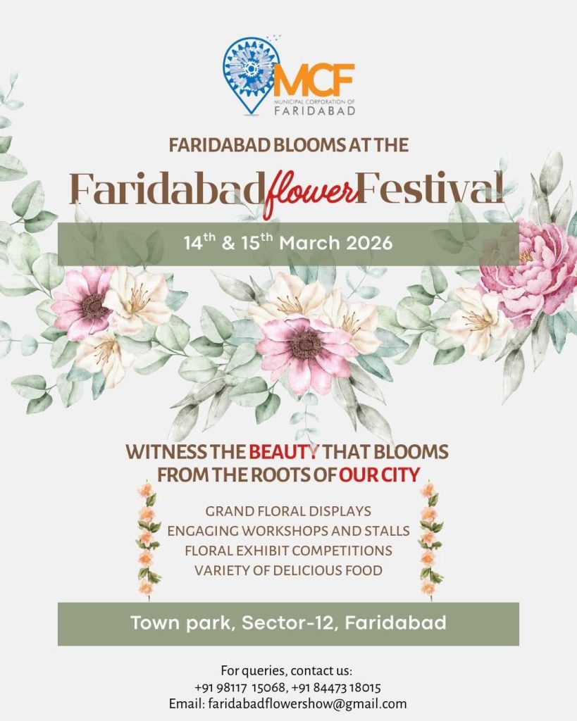 फरीदाबाद निगम आयुक्त (कमिश्नर) धीरेंद्र खड़गटा ने जानकारी देते हुए बताया कि नगर निगम द्वारा शहरवासियों के लिए फरीदाबाद फ्लावर फेस्टिवल 2026 का आयोजन किया जा रहा है। यह भव्य आयोजन 14 व 15 मार्च 2026 को टाउन पार्क सेक्टर 12 फरीदाबाद में आयोजित होगा।
