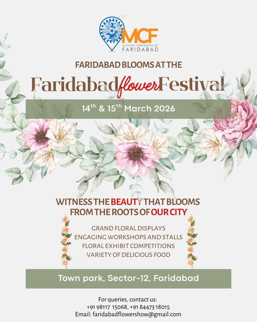 उन्होंने बताया कि कार्यक्रम से संबंधित किसी भी जानकारी के लिए नागरिक मोबाइल नंबर 98117-15068 और 84473-18015 पर संपर्क कर सकते हैं या ई-मेल faridabadflowershow@gmail.com पर भी जानकारी प्राप्त कर सकते हैं।