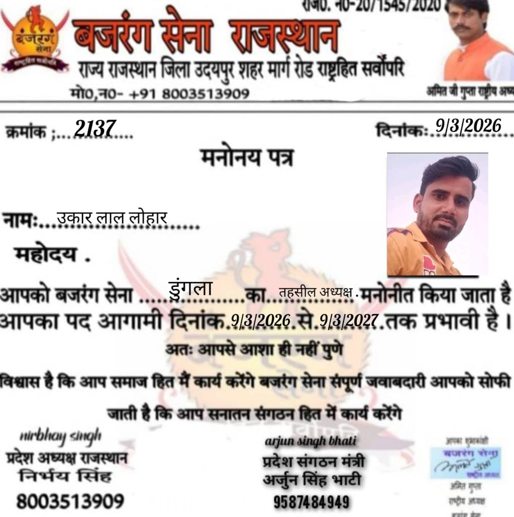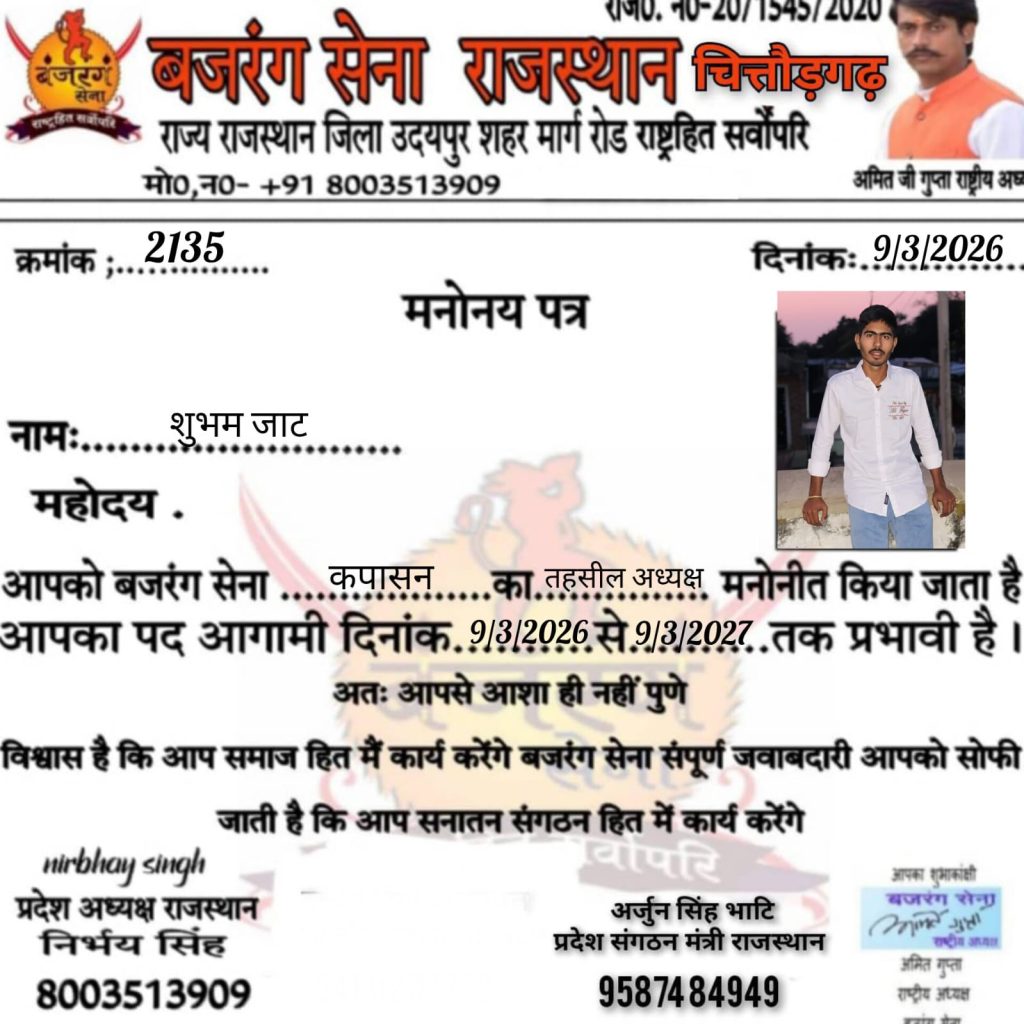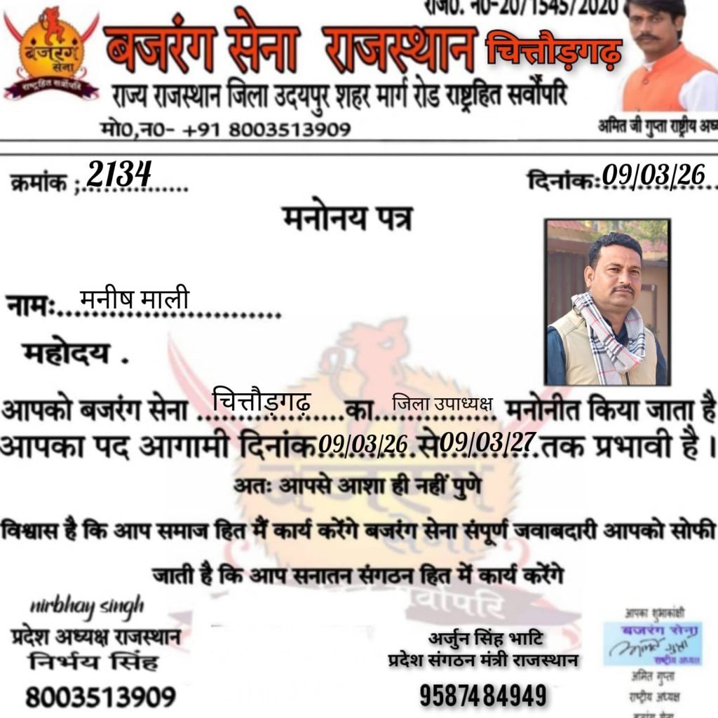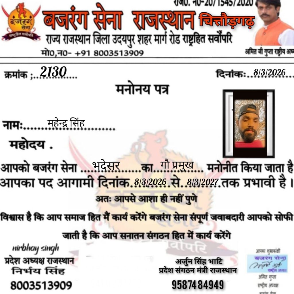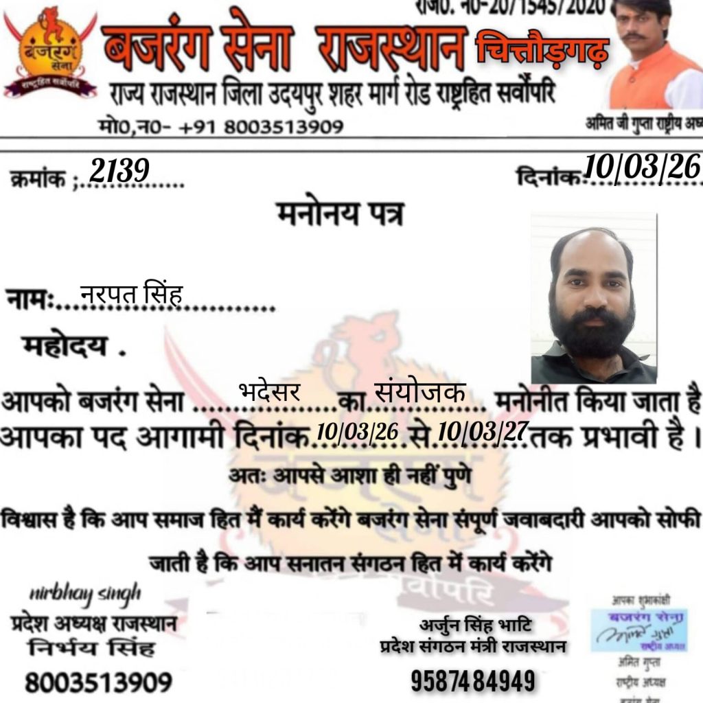 बजरंग सेना राष्ट्रीय अध्यक्ष अमित गुप्ता राजस्थान प्रदेशाध्यक्ष निर्भय सिंह पुषपेन्द सिंह चित्तौड़गढ़ प्रभारी पुष्पेंद्र सिंह सोलंकी द्वारा रोड सिंह को भदेसर सचिव एवं नरपत सिंह को भदेसर तहसील संयोजक एवं जसवंत सिंह को तहसील प्रभारी भदेसर एवं उकार लाल लोहार की डुंगला तहसील अध्यक्ष एवं शुभम जाट को कपासन तहसील अध्यक्ष एवं रोशन लाल को कपासन तहसील उपाध्यक्ष एवं कालु सिंह को बड़ीसादड़ी प्रभारी एवं मनीष माली चित्तौड़ जिला उपाध्यक्ष एवं छोटु सिंह भदेसर तहसील संयोजक दिनेश सिंह भदेसर तहसील मंत्री एवं महेन्द्र सिंह को गौ प्रमुख एवं प्रताप सिंह भदेसर संगठन मंत्री रतन लाल रेबारी को संगठन मंत्री 2 एवं चंदन सिंह को चित्तौड़ गढ जिला उपाध्यक्ष मनोनीत किया।