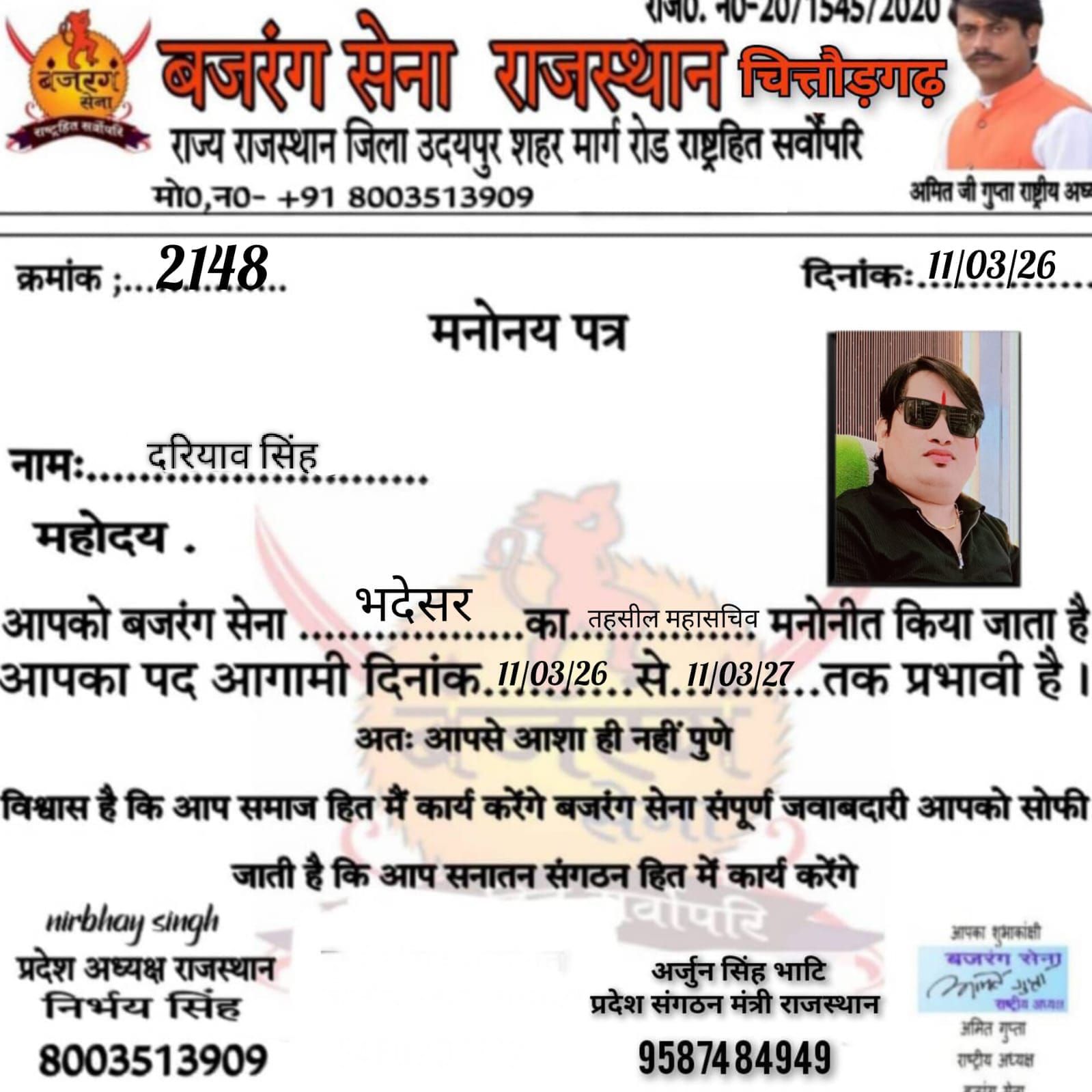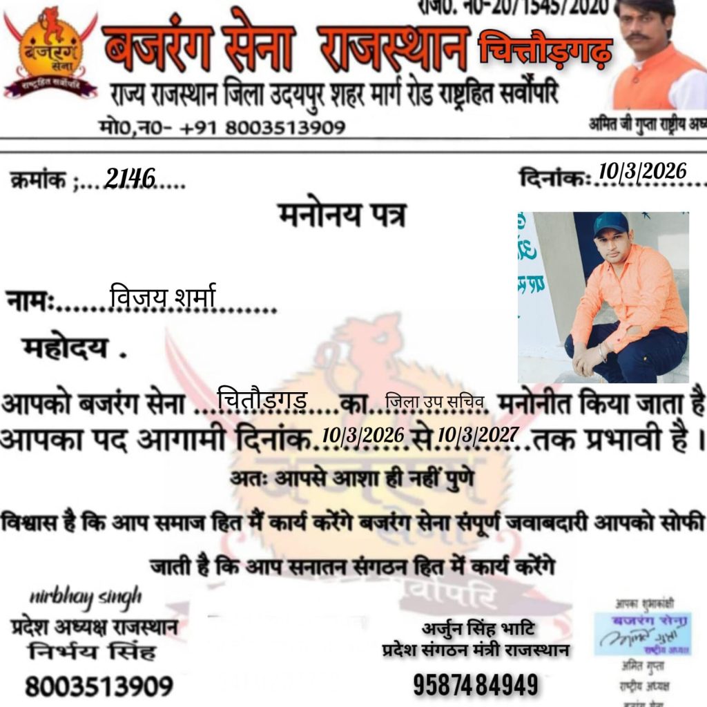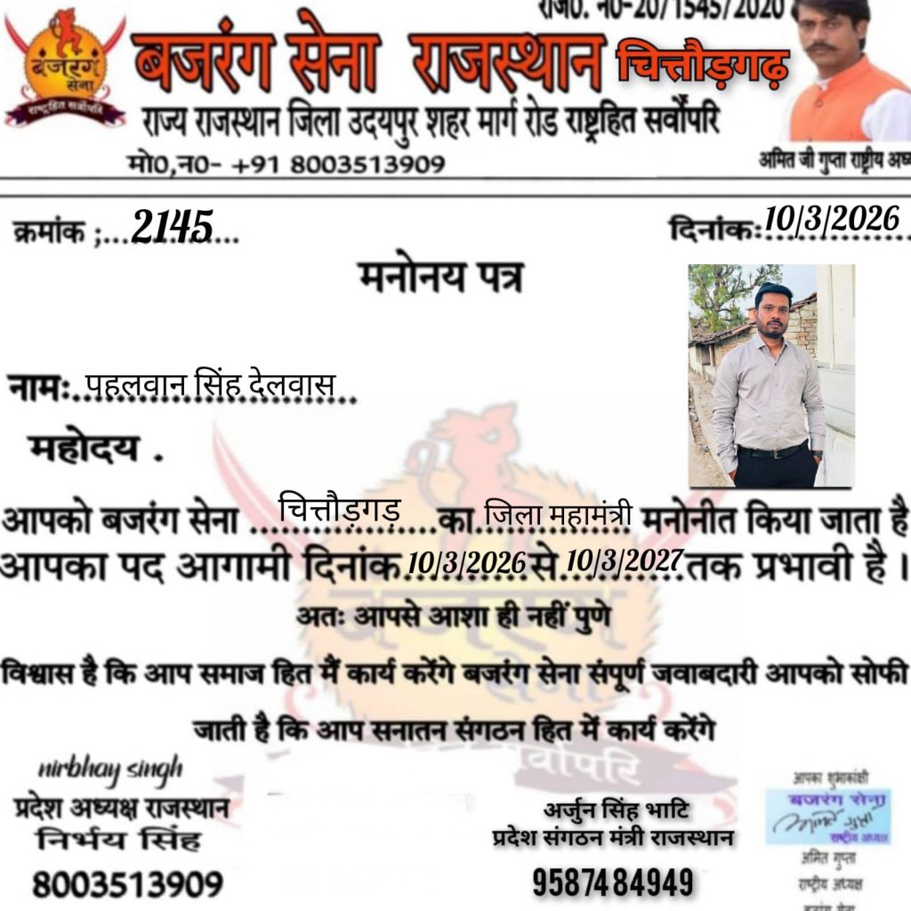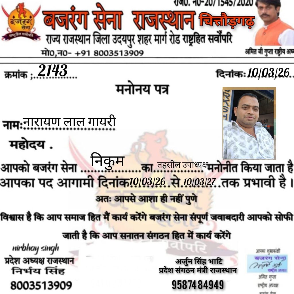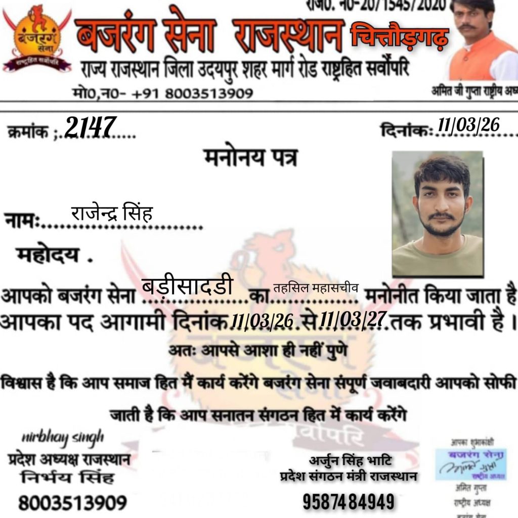बजरंग सेना के राष्ट्रीय अध्यक्ष अमित गुप्ता निर्भयसिंह राजस्थान प्रदेशाध्यक्ष पुष्पेंद्रसिंह सिंह चित्तौड़गढ़ प्रभारी द्वारा पहलवान सिंह देलवास को चित्तौड़गड़ महामंत्री एव विजय शर्मा चित्तौड़गढ़ जिला उपसचिव गजेंद्र सिंह बड़ी सादड़ी महासचिव दरियाव सिंह भदेशर महासचिव नारायण लाल गायरी निकुम उप तहसील उपाध्यक्ष रामनारायण जनवा तहसिल उपाध्यक्ष निकुम मनोनीत किया गौ माता कोराष्ट्र माता का दर्जा दिया जाएएवं संगठन के प्रति कड़ी से कड़ी मेहनत करके बढ़ावा दिया जाए एवं बड़ी मीटिंग रखने का बहुत जल्दी प्लानिंग की है।