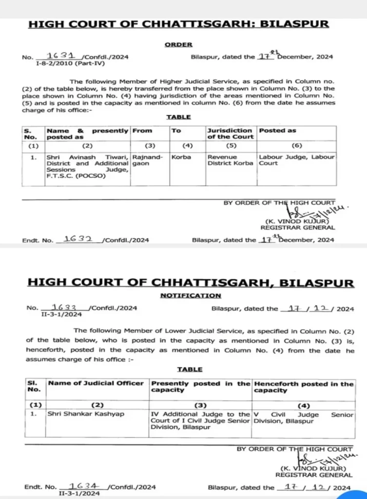 बिलासपुर 18 दिसंबर 2024:- छत्तीसगढ़ हाईकोर्ट ने सिविल जजों के तबादला और प्रमोशन का आदेश जारी किया है। जारी आदेश के मुताबिक कुछ जजों का तबादला हुआ है वहीं कुछ का तबादले के साथ प्रमोशन भी हुआ है।5 सेशन जजों के तबादलेजारी आदेश के मुताबिक, कुल 5 सेशन जजों का तबादला किया गया है। इसके अलावा 40 सिविल जजों का ट्रांसफर भी कर दिया गया है। 42 सीनियर सिविल जज जो सीजेएम रैंक के थे, उन्हें प्रमोट कर डिस्ट्रिक्ट एंड एडिशनल सेशन जज बनाया गया है। प्रमोशन के साथ इनका तबादला भी कर दिया गया |
