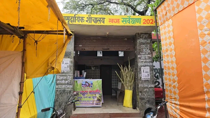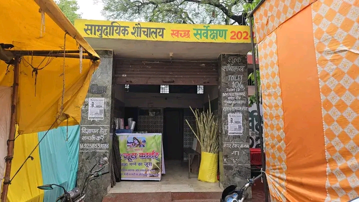 मेला कमेटी की लापरवाही के चलते शौचालय में लगा पीके जूस कॉर्नर।