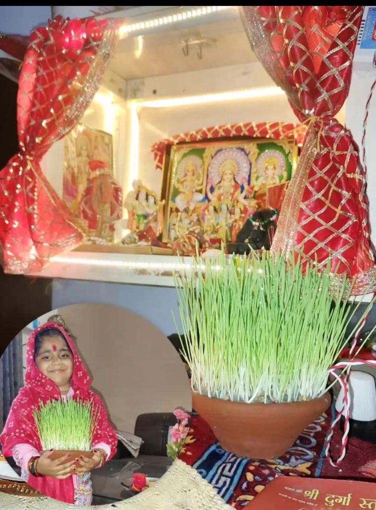 आप देख रहे है कि आध्या शर्मा पूरे श्रद्धा भाव के साथ पूजा स्थल के सामने हरे-भरे जौ( नवरात्रि के प्रतीक) को हाथों मे लेकर भगवान के प्रति अपनी भक्ति व्यक्त कर रही है