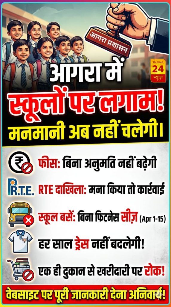 आगरा में निजी स्कूलों की मनमानी पर प्रशासन का बड़ा एक्शन। फीस, यूनिफॉर्म, किताब और स्कूल बस, अब सब कुछ होगा पारदर्शी और नियमों के दायरे में। जिलाधिकारी की अध्यक्षता में हुई जिला शुल्क नियामक समिति की बैठक में साफ संदेश दिया गया—अब स्कूल अपनी वेबसाइट पर फीस से लेकर बसों की फिटनेस, ड्राइवर का ब्यौरा और हर प्रकार के शुल्क का पूरा विवरण अनिवार्य रूप से अपलोड करेंगे। नियम तोड़ने पर एफआईआर, जुर्माना और मान्यता रद्द तक की कार्रवाई होगी ।