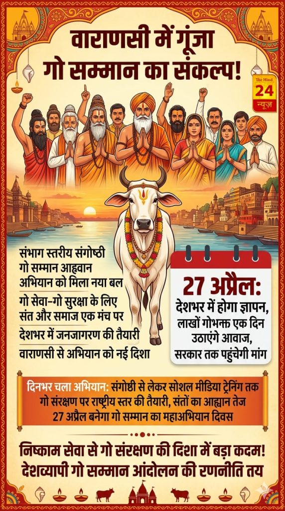 वाराणसी। गौमाता को सम्मान दिलाने के उद्देश्य से पूरे देश में चल रहे “गो सम्मान आह्वान अभियान” के अंतर्गत आज 12 अप्रैल (रविवार) को काशी के आदि शंकराचार्य मठ, बैजनत्था मंदिर के समीप, कमच्छा में एक दिवसीय संभाग स्तरीय संगोष्ठी एवं पत्रकार वार्ता का आयोजन किया गया। समिति द्वारा निर्धारित कार्यक्रम के अनुसार आयोजन की शुरुआत सुबह 9:00 बजे जलपान से होगी। इसके बाद