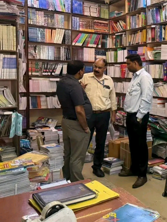 जांच में रस्तोगी बुक डिपो पर अनियमितता मिलने पर माल सीज किया गया और ₹5.37 लाख का जुर्माना लगाया गया, जिसे जमा कर दिया गया है।