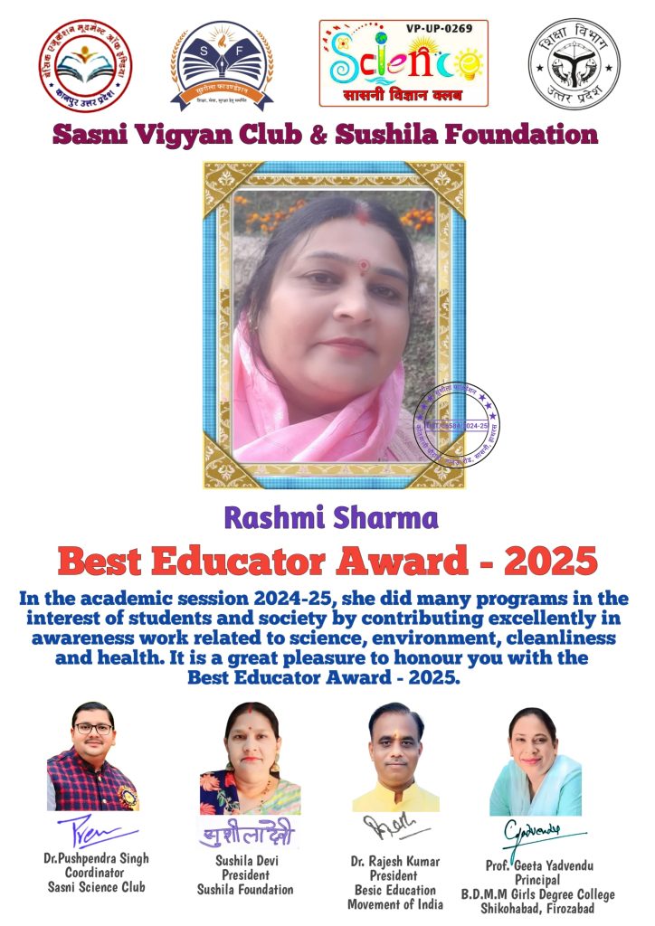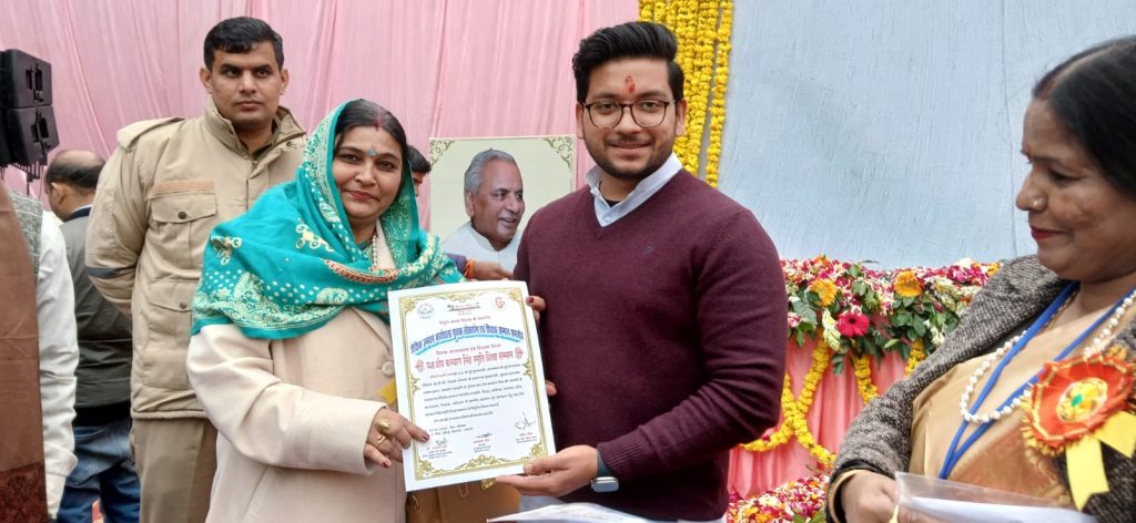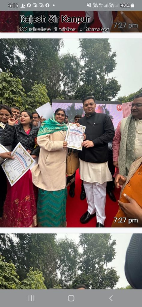 निपुण भारत के अंतर्गत राष्ट्रीय शिक्षक कार्यशाला लखनऊ पुस्तक लोकपण एवं शिक्षक सम्मान समारोह जनवरी 2025 को हिंदू धर्म के पुरोधा प्रखर हिंदुत्ववादी उत्तर प्रदेश के मुख्यमंत्री ब राजस्थान के पूर्व राज्यपाल स्वर्ग श्री कल्याण जी की जयंती के अवसर पर बेसिक शिक्षा मंत्री उत्तर प्रदेश माननीय संदीप सिंह जी के द्वारा शिक्षक सम्मानित किए गए जिसमें सिहोरा गांव के लिए बहुत ही गर्व की बात है कि एक महिला की हर गरीब और किसी के बुरे वक्त में उनको सहारा देने वाली को आज श्रीमती रश्मि शर्मा को बेसिक शिक्षा मंत्री के कमल द्वारा सम्मानित किया गया