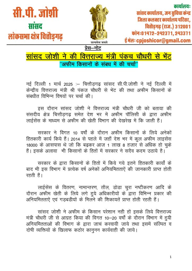 इस दौरान सांसद जोशी ने वित्तराज्य मंत्री चौधरी जी को बताया की संसदीय क्षेत्र चित्तौड़गढ़ समेत देश भर में अफीम पॉलिसी के द्वारा अफीम लाईसेंस के माध्यम से अफीम की खेती विभाग की देखरेख में कि जाती हैं।