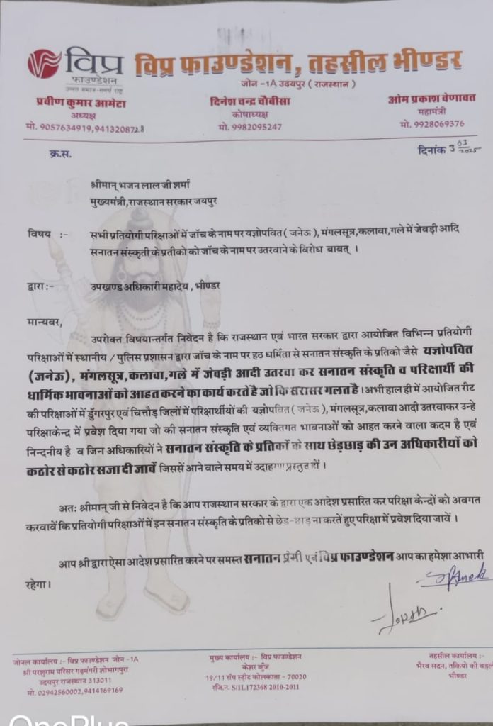 विप्र फाउंडेशन तहसील भींडर के पदाधिकारी एवं सनातन प्रेमियों ने मुख्यमंत्री राजस्थान सरकार के नाम उपखंड अधिकारी भींडर को ज्ञापन सौंपकर अवगत कराया कि राजस्थान एवं भारत सरकार द्वारा आयोजित विभिन्न परीक्षा केंद्र पर प्रतियोगी परिक्षाओं में स्थानीय / पुलिस प्रशासन द्वारा जाँच के नाम पर हठ धर्मिता से सनातन संस्कृति के प्रतिको जैसे यज्ञोपवित (जनेऊ), मंगलसूत्र, कलावा, गले में जेवड़ी आदी उतरवा कर सनातन संस्कृति व परिक्षार्थी की धार्मिक भावनाओं को आहत करने का कार्य करते है जो कि सरासर गलत है इस कृत्य की विप्रफाउंडेशन तहसील भींडर गौर निंदा करता है। अभी हाल ही में आयोजित रीट की परिक्षाओं में डुंगरपुर एवं चित्तौड़गढ़ जिलों में परिक्षार्थीयों की यज्ञोपवित (जनेऊ), मंगलसूत्र, कलावा आदी उतरवाकर उन्हे परिक्षा केन्द्र में प्रवेश दिया गया था जो की सनातन संस्कृति एवं व्यक्तिगत भावनाओं को आहत करने वाला कदम है एवं निन्दनीय है आगामी परीक्षाओं में ऐसे कृत्य की पुनरावृत्ति ना हो ऐसा आदेश पारित करवाने की मांग की व जीन अधिकारियों ने सनातन संस्कृति के प्रतिकों के साथ छेड़छाड़ की उन अधिकारीयों को कठोर से कठोर सजा दी जावें जिससें आने वाले समय में ऐसे कृत्य की पुनरावृत्ति नहीं हो