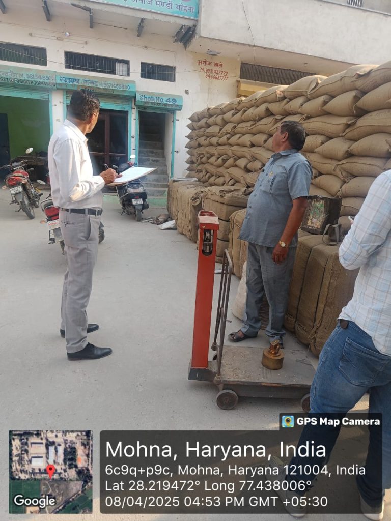 तदोपरांत मोहना अनाज मंडी के आसपास स्थित प्राइवेट 4 धर्म कांटाओं तथा खाद एवं आपूर्ति विभाग के तिगांव गोदाम स्थित धर्म कांटा पर नापतोल प्रक्रिया को चेक किया गया।