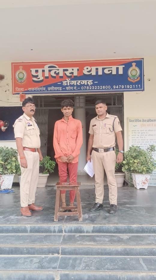03.05.2025 *डोंगरगढ़* :-* डोंगरगढ़ पुलिस द्वारा क्षेत्र में लगातार अवैध गतिविधियों में संलिप्त व्यक्तियों, संदिग्धों, चाकुबाजों एवं अन्य असमाजिक तत्वों पर कड़ी निगरानी रखकर लगातार कार्यवाही कर रही है इसी कड़ी में दिनांक- 01.05.2025 को डोंगरगढ़ पुलिस को सूचना मिला कि नीचे बम्लेश्वरी मंदिर के सामने नारियल प्रसाद दुकान के पास एक व्यक्ति अपने पास बटनवाला चाकू रखकर लोगों को दिखाकर डरा धमका रहा है कि सूचना पर डोंगरगढ़ पुलिस तत्काल मौके पर पंहुचकर आरोपी महेश्वर ठाकुर पिता टीकम ठाकुर उम्र- 19 साल निवासी अटल आवास कन्या शाला रोड डोंगरगढ़ जिला राजनांदगंाव छ0ग0 को चाकू दिखाकर लोगों को डराते धमकाते रंगे हाथ पकड़कर आरोपी से एक नग बटनवाला चाकू जप्त कर आरोपी के विरूद्ध धारा- 25 आर्म्स एक्ट के तहत कार्यवाही किया गया है। नाम आरोपी-* महेश्वर ठाकुर पिता टीकम ठाकुर