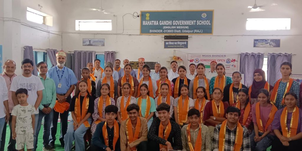 नगर के पीएम श्री महात्मा गांधी राजकीय इंग्लिश मीडियम स्कूल का 10 वी कक्षा का परीक्षा परिणाम जिले में सर्वश्रेष्ठ रहा। आज विद्यालय परिसर के सभागार में 10 वी कक्षा के सभी 49 विद्यार्थीयो का अभिनंदन किया गया। समारोह की अध्यक्षता संस्था प्रधान श्री अशोक कुमार जोशी ने कि उन्होंने अपने स्वागत उदबोधन में सभी बच्चों को बधाई देते हुए अभिभावक से उनके उज्जवल भविष्य की शुभकामनाएं व्यक्त की और आने वाले वर्षों में इन विद्यार्थियों के लिए बेहतर भविष्य की योजना पर अपना विचार प्रस्तुत किया। समारोह के मुख्य अतिथि भिंडर नगर पालिका के पार्षद श्री सुरेश कंठालिया ने सभी विद्यार्थियों को अपना आशीर्वाद प्रदान करते हुए उनके उज्जवल भविष्य की शुभकामनाएं व्यक्त की। समारोह के आयोजक एसडीएमसी के विधायक प्रतिनिधि श्री मुरली मनोहर तिवारी और श्री कृष्ण गोपाल मूंदड़ा ने विद्यालय के सभी सफल विद्यार्थियों को अपना आशीर्वाद प्रदान करते हुए उनके उज्जवल भविष्य की योजना पर कार्य करने में अपनी तरफ से पूर्ण सहयोग का आश्वासन दिया। आज के आयोजन में विशिष्ट अतिथि के रूप में श्री श्याम लाल साहू उद्योगपति समाजसेवी ने सभी विद्यार्थियों को अपनी तरफ से हर तरह से सहयोग देने के लिए अपना मत व्यक्त किया। विद्यालय के विकास के लिए उन्होंने अपना सहयोग प्रदान करने के सहमती व्यक्त की। उपस्थित अभिभावक जगतपति सोनी, श्रवण व्यास, वंदना आदि में से अधिकांश माता-पिता ने विद्यालय के संस्था प्रधान और सभी शिक्षक साथियों का आभार व्यक्त किया और उन्होंने उनके द्वारा किए गए अध्यापन और प्रयास के प्रति अपनी कृतज्ञता प्रकट की। वाइस प्रिंसिपल ने सभी उपस्थित बच्चों को उनके परीक्षा परिणाम के लिए बधाई देते हुए अभिभावक का आभार व्यक्त किया।