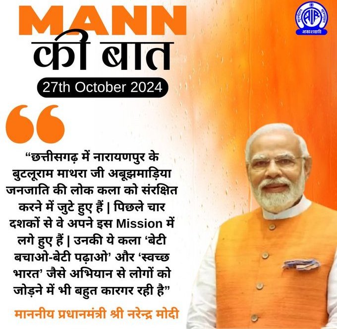 रायपुर, 27 अक्टूबर 2024/प्रधानमंत्री श्री नरेंद्र मोदी ने अपने चर्चित रेडियो कार्यक्रम ‘मन की बात’ के 115वें एपिसोड में आज रविवार को सुबह जब छत्तीसगढ़ के नारायणपुर के श्री बुटलूराम माथरा का जिक्र किया, तो लोक कला को बचाने और उसे आगे बढ़ाने के लिए वर्षों से की जा रही उनकी मेहनत राष्ट्रीय मंच पर चमक उठी। यह पल था छत्तीसगढ़ की समृद्ध सांस्कृतिक विरासत और उसे संजोने वाले उन गुमनाम नायकों को सलाम करने का, जिनके प्रयासों ने इस धरोहर को जीवित रखा है।प्रधानमंत्री श्री नरेन्द्र मोदी ने मन की बात में बुटलूराम जी की कहानी साझा करते हुए बताया कि वे पिछले चार दशकों से अबूझमाड़िया जनजाति की अनूठी लोक कला को बचाने और आगे बढ़ाने के लिए सतत प्रयासरत हैं। “बुटलूराम जी ने लोक कला की उन धरोहरों को सहेज कर रखा है, जिनमें छत्तीसगढ़ की संस्कृति की गूंज है। उनकी लगन और निष्ठा आने वाली पीढ़ियों के लिए प्रेरणास्रोत है।‘‘ प्रधानमंत्री की यह सराहना, उस समर्पण की गवाही थी, जो बुटलूराम जी ने अपनी संस्कृति को संरक्षित करने के लिए दी है, जिससे न केवल छत्तीसगढ़ का नाम रोशन हुआ है, बल्कि पूरी दुनिया के सामने उसकी विशिष्टता भी उभरी है। मुख्यमंत्री श्री विष्णु देव साय ने प्रधानमंत्री श्री नरेन्द्र मोदी जी द्वारा लोक कला के संरक्षण और संवर्धन में जुटे नारायणपुर के बुटलूराम माथरा की सराहना किए जाने पर प्रसन्नता जताई है। उन्होंने कहा कि यह अच्छी बात है कि प्रधानमंत्री जी ने लोक कला के क्षेत्र में अच्छा काम कर रहे कलाकारों की प्रशंसा की है। श्री बुटलूराम माथरा जी ने लोक कला को संरक्षित करने की दिशा में बहुत अच्छा काम किया है। उन्होंने प्रधानमंत्री जी के बेटी बचाओ, बेटी पढ़ाओ तथा स्वच्छ भारत को आगे बढ़ाने की दिशा में बड़ा काम भी किया है। नारायणपुर में आदिवासी संस्कृति अपने सबसे मूल रूप में है। हमारी सरकार श्री माथरा जी के प्रयासों को बढ़ावा देगी।