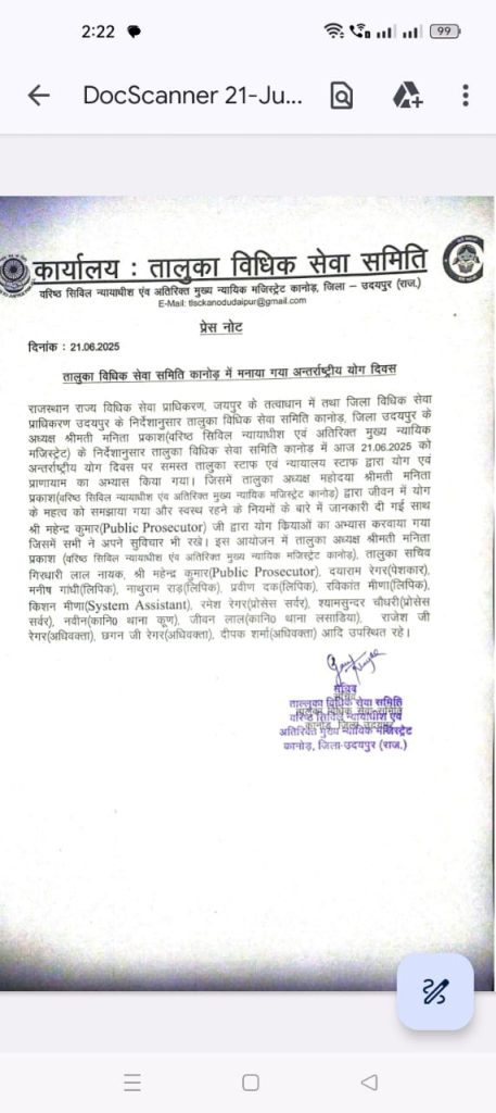 राजस्थान राज्य विधिक सेवा प्राधिकरण, जयपुर के तत्वाधान में तथा जिला विधिक सेवा प्राधिकरण उदयपुर के निर्देशानुसार तालुका विधिक सेवा समिति कानोड़, जिला उदयपुर के अध्यक्ष श्रीमती मनिता प्रकाश (वरिष्ठ सिविल न्यायाधीश एवं अतिरिक्त मुख्य न्यायिक मजिस्ट्रेट) के निर्देशानुसार तालुका विधिक सेवा समिति कानोड़ में आज 21.06.2025 को अन्तर्राष्ट्रीय योग दिवस पर समस्त तालुका स्टाफ एवं न्यायालय स्टाफ द्वारा योग एवं प्राणायाम का अभ्यास किया गया। जिसमें तालुका अध्यक्ष महोदया श्रीमती मनिता प्रकाश (वरिष्ठ सिविल न्यायाधीश एंव अतिरिक्त मुख्य न्यायिक मजिस्ट्रेट कानोड़) द्वारा जीवन में योग के महत्व को समझाया गया और स्वस्थ रहने के नियमों के बारे में जानकारी दी गई साथ महेन्द्र कुमार (पब्लिक प्रॉसिक्यूटर) द्वारा योग कियाओं का अभ्यास करवाया गया जिसमें सभी ने अपने सुविचार भी रखे। इस आयोजन में तालुका अध्यक्ष श्रीमती मनिता प्रकाश (वरिष्ठ सिविल न्यायाधीश एंव अतिरिक्त मुख्य न्यायिक मजिस्ट्रेट कानोड), तालुका सचिव गिरधारी लाल नायक, महेन्द्र कुमार (पब्लिक प्रॉसिक्यूटर), दयाराम रेगर (पेशकार), मनीष गांधी (लिपिक), नाथुराम, (लिपिक), प्रवीण दक (लिपिक), रविकांत मीणा (लिपिक), किशन मीणा (सिस्टम असिस्टेंट), रमेश रेगर (प्रोसेस सर्वर), श्यामसुन्दर चौधरी (प्रोसेस सर्वर), नवीन (कानि० थाना कूण), जीवन लाल (कानि० थाना लसाडिया), राजेश रेगर (अधिवक्ता), छगन रेगर (अधिवक्ता), दीपक शर्मा (अधिवक्ता) आदि उपस्थित रहे।