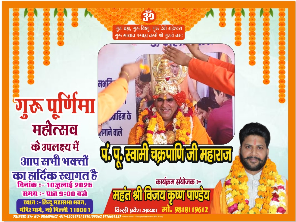 अखिल भारत हिन्दू महासभा के वरिष्ठ मीडिया प्रभारी संतोष मिश्रा ने बताया है कि मीटिंग में प्रदेश अध्यक्ष महंत श्री विजय कृष्ण पांडेय जी के अध्यक्षता मे संपन्न हुई जिसमें गुरु पूर्णिमा महोत्सव की तैयारी और गुरु शिष्य के रिश्तों के बारे मे सभी को महत्वपूर्ण बिंदुओं के बारे मे जानकारी दी और सभी सम्मानित पदाधिकारियों को अपने दायित्व की जिम्मेदारी को सही से निभाने की बात कही सभी सम्मानित सदस्यों एवं पदाधिकारियों को बहुत ही हर्ष के साथ सूचित किया कि 10 जुलाई को गुरु पूर्णिमा है इस दिन हम सभी मिलकर अपने गुरु, आराध्य, हिन्दू ह्रदय सम्राट परम् पूज्य स्वामी श्री चक्रपाणि महाराज जी का भव्यता से पूजन और स्वागत करेंगे और उनसे आशीर्वाद प्राप्त करेंगे, गुरु को देने के लिए आप सभी अपने स्वेक्षा से जो भी भेंट देना चाहते है अपने स्वेक्षा के अनुसार भेंट ला सकते है यह कार्यक्रम अखिल भारत हिन्दू महासभा के दिल्ली प्रदेश अध्यक्ष महंत विजय कृष्ण पांडेय जी के निर्देशानुसार किया जाएगा जिसके कार्यक्रम संयोजक अध्यक्ष महंत विजय कृष्ण पांडेय ही होंगे और जिसमें दिल्ली प्रदेश के साथ अन्य प्रदेश से पदाधिकारियों और सम्मानित सदस्य उपस्थित होंगे यह गुरु महोत्सव के द्वारा पूरे देश मे दिल्ली प्रदेश का संदेश राष्ट्रीय अस्तर पर जाएगा इसलिए आप सभी से निवेदन है कि गुरु पूर्णिमा महोत्सव को शानदार तरीके से पूर्ण हो इसके लिए आप सभी अपने सामर्थ्य के हिसाब से तन मन धन से सहयोग करें जिसमें कि दिल्ली प्रदेश का यह कार्यक्रम पूरे देश मे एक अग्रणी छाप छोड़े प्रदेश अध्यक्ष महंत विजय कृष्ण पांडेय जी ने सभी सनातनियों को एकजुट होकर कार्य करने की सलाह दी और संगठन का विस्तार करने के लिए सदस्यता अभियान के तहत सभी हिन्दू भाइयों को एकत्र करने और अखिल भारत हिन्दू महासभा का नारा जाति पाति की करो विदाई हिन्दू हिन्दू भाई भाई के तहत सभी को संगठित करने की प्रेरणा दी है अखिल भारत हिन्दू महासभा के दिल्ली प्रदेश अध्यक्ष ने कहा है कि मनुष्य का बड़ा होना अच्छी बात है लेकिन उसके व्यक्तित्व में गहराई और विचारों मे शुद्धता भी होनी चाहिए तभी वह महान बनता है जब रिश्ता नया होता है और जब वही रिश्ता पुराना हो जाता है तो लोग दूर होने का बहाना ढूंढ़ते हैं बहुत किस्मत वाले होते है वे लोग जिन्हें समय और समझ नही आती जब समझ आती है तो समय हाथ से निकल जाता है यदि मनुष्य के भीतर दूसरों के प्रति प्रेम नहीं है तो वह पूर्ण मनुष्य नही बन सकता क्योंकि प्रेम ही मनुष्य को वास्तव मे मनुष्य बनाता है यदि हम किसी को नमस्कार इस अपेक्षा से करते है कि वह भी हमें नमस्कार करेगा तो वह नमस्कार केवल दिखावा है वास्तविक नमस्कार तो संस्कार से उपजता है न कि अंहकार से हर दिन सु
