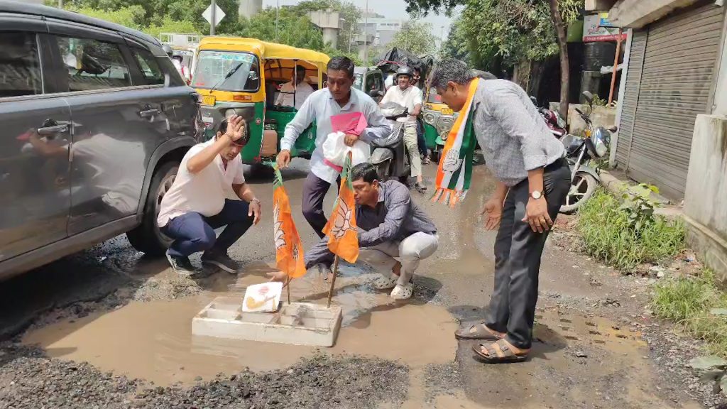 सूरत में पहले ही बारिश में कई सड़कों पर गड्ढे पड़ गए हैं। इसी को लेकर यूथ कांग्रेस ने मंगलवार को अनोखे तरीके से विरोध प्रदर्शन किया।