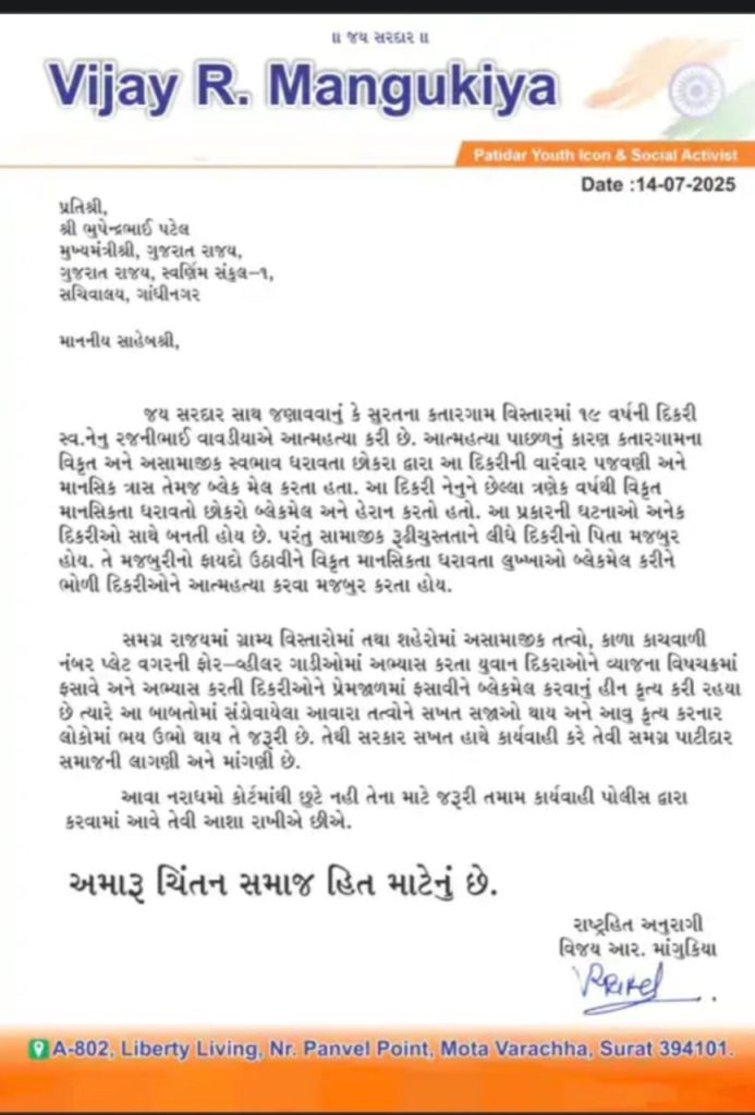 इस मामले को लेकर पाटीदार समाज के सामाजिक अग्रणी विजय मांगुकिया ने मुख्यमंत्री को एक पत्र लिखा है, जो सोशल मीडिया पर वायरल हो रहा है।