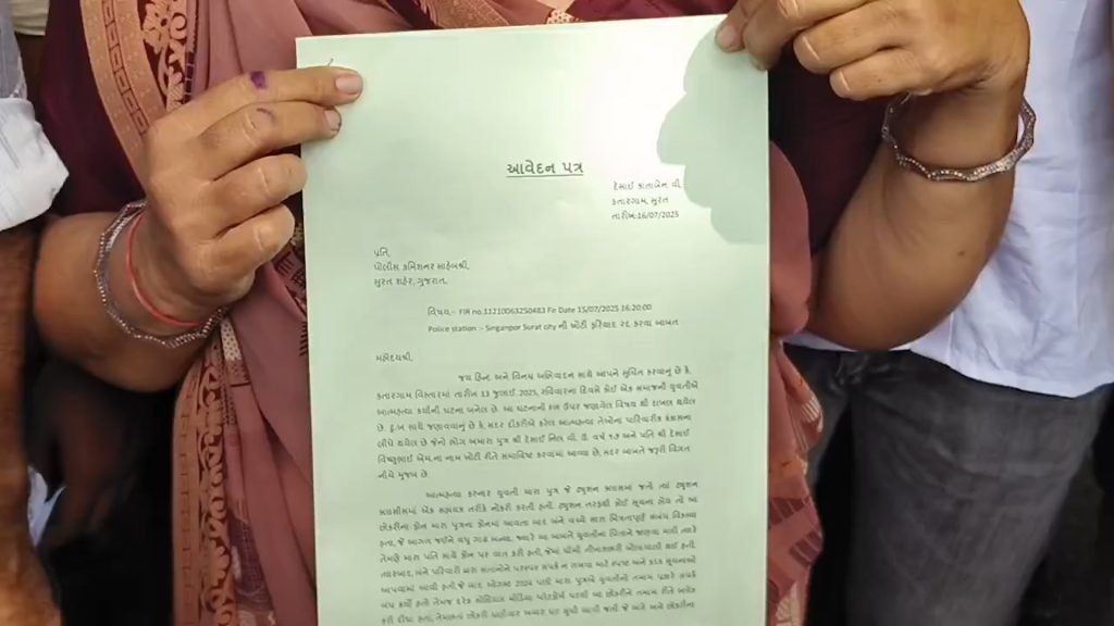 इस बीच, आरोपी युवक की मां कांताबेन देसाई ने पुलिस आयुक्त को एक पत्र लिखा है, जिसमें FIR संख्या 11210063250483 (दिनांक 15 जुलाई 2025) को निराधार बताते हुए उसे रद्द करने की मांग की गई है। पत्र में उन्होंने लिखा: