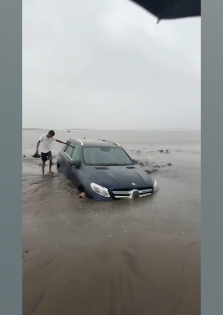 कार समुद्र के बीच में जाकर पानी में फंस गई।
