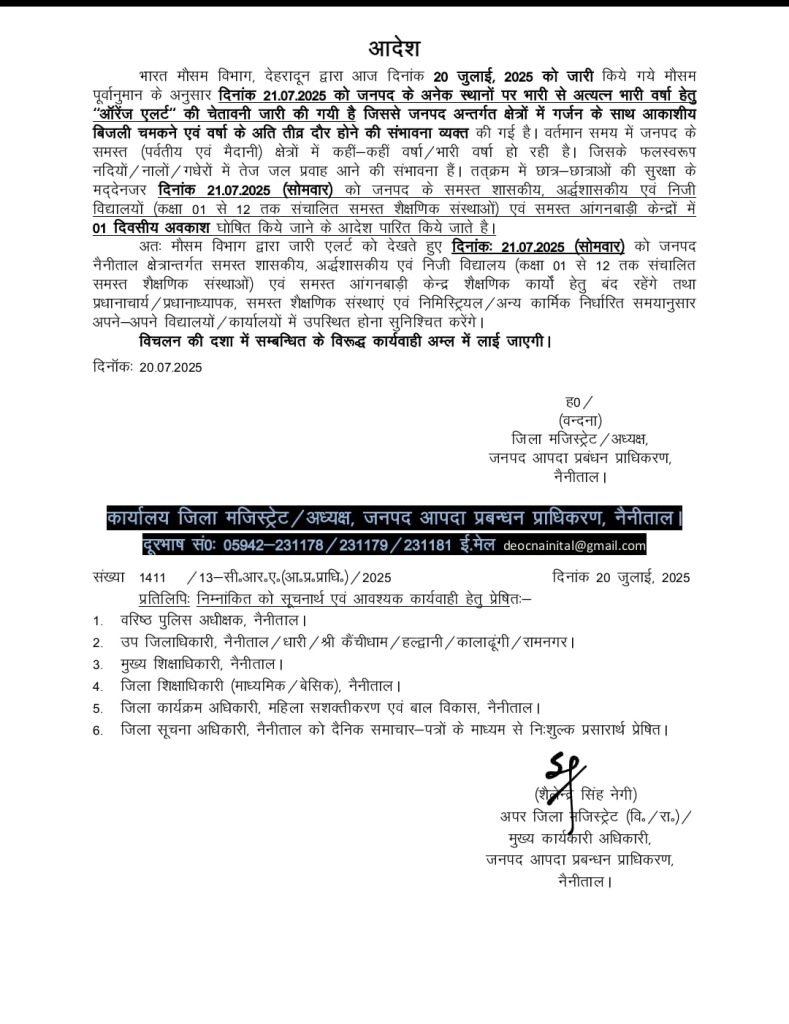 इस सम्बन्ध में जानकारी देते हुए जिलाधिकारी वंदना ने अवगत कराया कि संभावित आपदा जोखिमों जैसे भूस्खलन, सड़क अवरोध, जलभराव, एवं नदी-नालों में तेज बहाव को ध्यान में रखते हुए विद्यार्थियों की सुरक्षा हेतु जनपद नैनीताल में संचालित सभी शासकीय, अशासकीय एवं निजी विद्यालय (कक्षा 1 से 12 तक) एवं समस्त आंगनबाड़ी केंद्रों में दिनांक 21 जुलाई 2025 (सोमवार) को एक दिवसीय अवकाश रहेगा।