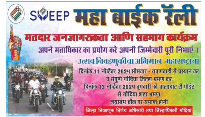 गोंदिया : विधानसभा सार्वत्रिक निवडणूक-2024 अंतर्गत मतदानाची टक्केवारी वाढावी यासाठी SVEEP कार्यक्रमांतर्गत जिल्हा निवडणूक अधिकारी तथा जिल्हाधिकारी प्रजित नायर यांच्या मार्गदर्शनात मुख्य कार्यकारी अधिकारी तथा SVEEP नोडल अधिकारी एम. मुरुगानंथम यांच्या नियोजनाने दिनांक 11 नोव्हेंबर व 13 नोव्हेंबर 2024 रोजी गोंदिया जिल्ह्यात जिल्हाभर शेकडो मतदारांच्या सहभागाने महाबाईक रॅलीचे आयोजन करण्यात येणार आहे. या महाबाईक रॅलीची सुरुवात 11 नोव्हेंबरला गोंदिया तालुक्यातील रावणवाडी गावापासून होत असून तिरोडा, गोरेगाव, सडक अर्जुनी, अर्जुनी मोरगाव, देवरी, सालेकसा, आमगाव फिरत फिरत गोंदियाला पोहोचणार. तसेच 13 नोव्हेंबर रोजी गोंदिया येथील बालाघाट टी पॉईंट वरुन महाबाईक रॅलीची सुरुवात होणार असून संपूर्ण गोंदिया शहरात भ्रमण करुन रॅलीची सांगता जयस्तंभ चौक, गोंदिया येथे होणार आहे.[11/10, 09:03] jubesheikh123996: गटविकास अधिकारी, तालुका नोडल अधिकारी, गटशिक्षणाधिकारी, न.प.मुख्याधिकारी, ग्रामसेवक, तलाठी यांच्या प्रयत्नाने महाबाईक रॅली यशस्वीरित्या पूर्ण करणार आहेत. यामध्ये जिल्हा निवडणूक अधिकारी तथा जिल्हाधिकारी प्रजित नायर स्वतः महाबाईक रॅलीला मार्गदर्शन करणार आहेत. महाबाईक रॅलीमध्ये जास्तीत जास्त संख्येने सहभागी होऊन लोकशाहीच्या पर्वामध्ये सर्वांनी सहभागी होऊन आपला सहयोग नोंदवावा असे आवाहन मुख्य कार्यकारी अधिकारी तथा SVEEP नोडल अधिकारी एम. मुरुगानंथम यांनी केले आहे. विधानसभा निवडणुकीत मतदानाची टक्केवारी 75 पेक्षा जास्त वाढविण्याचे आवाहन केले तसेच नागरिकांनी मतदान करून लोकशाहीला बळकट करावे असेही आवाहन त्यांनी केले.[11/10, 09:05] jubesheikh123996: उपविभागीय अधिकारी गोंदिया चंद्रभान खंडाईत, उपविभागीय अधिकारी अर्जुनी मोरगाव वरुणकुमार शहारे, उपविभागीय अधिकारी तिरोडा पूजा गायकवाड, उपविभागीय अधिकारी देवरी कविता गायकवाड तसेच SVEEP सहायक नोडल अधिकारी महेंद्र गजभिये, सहायक नोडल अधिकारी शिखा पिपलेवार आणि तहसीलदार महेंद्र गणवीर, तहसीलदार मोनिका कांबळे, तहसीलदार समशेर पठाण, तहसीलदार नारायण ठाकरे, तहसीलदार प्रज्ञा भोकरे, प्रदीप समरीत तालुका SVEEP नोडल अधिकारी गोंदिया, विनोद चौधरी तालुका SVEEP नोडल अधिकारी तिरोडा, स्वाती तायडे तालुका SVEEP नोडल अधिकारी, गिरीधर सिंगनजोडे तालुका SVEEP नोडल अधिकारी देवरी, डी.बी.साकुरे, जिल्हा SVEEP CELL केदार गोटेफोडे, चंद्रशेखर दमाहे, विजय लिल्हारे, सचिन धोपेकर, चंदू दुर्गे, संजय टेंभरे, मुकेश वासनिक, श्रीमती पारधीकर, श्रीमती शेट्टे, मोरेश्वर बडवाईक, आर.एस.चव्हाण, अनुप नागपुरे, मोरेश्वर बडवाईक, नितेश मालाधारी, संजयकुमार बिसेन, हर्षकुमार पवार, नरेंद्र गौतम, उमाशंकर पारधी, दिलीप हिरापूरे, तेजलाल भगत, विलास 
