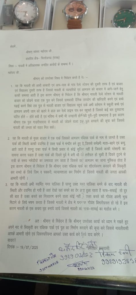 ज्ञापन में ग्रामीणों ने बताया के रेल्वे लाईन को पार करने के लिये पुल बनाने एंव पार्क का सौंदर्यकरण करने, मावली मे कचरे के निस्तारण कि व्यवस्था करें जिससे बारिस में नगरजनो में बिमारी नहीं फैले एंव आवरा पशु कचरा खाने से बचाया जा सके पशुओं मे बिमारी नही फैले