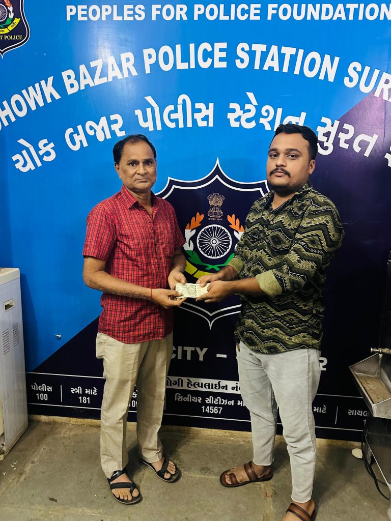 सूरत के चौक बाजार क्षेत्र में एक सराहनीय घटना सामने आई है। 52 वर्षीय एक बुज़ुर्ग, जो पान की गुमटी चलाकर अपना जीवन यापन करते हैं, एसबीआई बैंक के एटीएम में गलती से ₹10,000 भूल गए थे। यह रकम विवेक प्रजापति नामक एक युवक को मिली, जिसने ईमानदारी दिखाते हुए तुरंत चौक बाजार पुलिस को इसकी जानकारी दी।