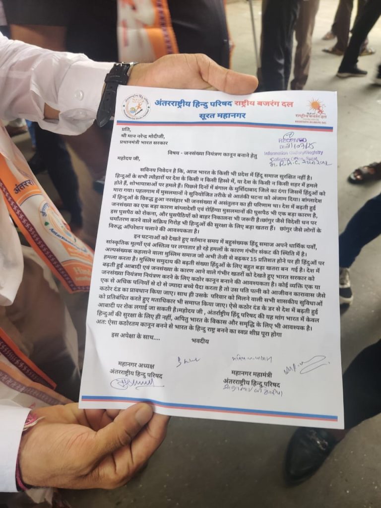 अंतरराष्ट्रीय हिन्दू परिषद और राष्ट्रीय बजरंग दल, सूरत महानगर ने प्रधानमंत्री नरेन्द्र मोदी को ज्ञापन भेजकर देश में जनसंख्या नियंत्रण कानून बनाए जाने की माँग की है। परिषद का कहना है कि कुछ समुदायों द्वारा तेज़ी से बढ़ रही जनसंख्या से हिन्दू समाज असुरक्षित महसूस कर रहा है।