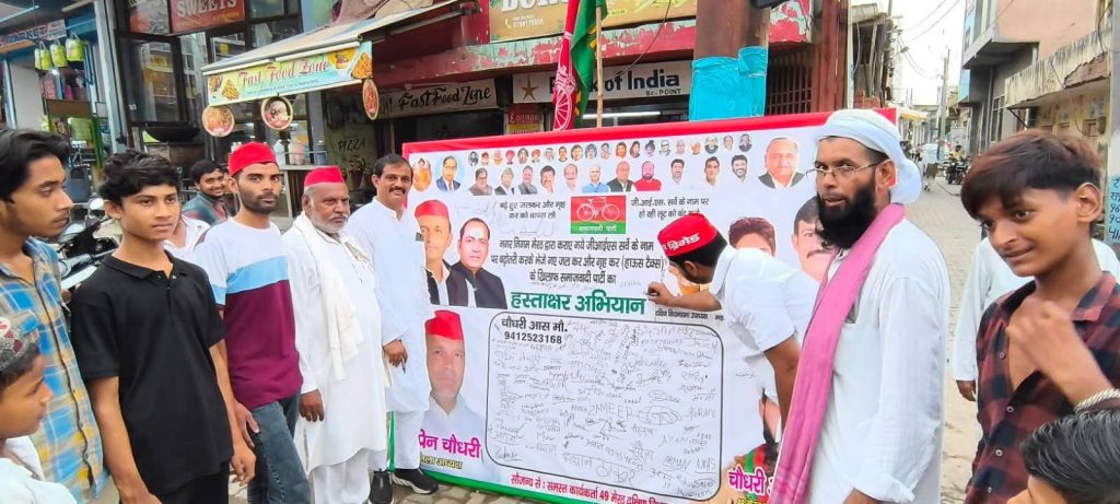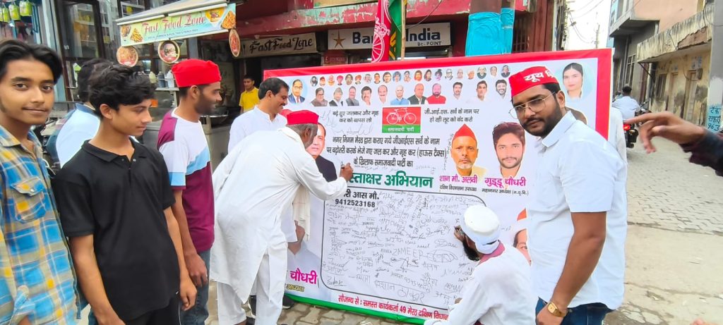 मेरठ महानगर समाजवादी पार्टी में पूर्व पार्षदों की ओर से आज वार्ड नंबर 81 तारापुरी मुमताज नगर में हाल के पास नगर निगम द्वारा बनाए गए हाउस टैक्स के विरोध में एवं जी आई एस सर्व सर्वे के विरोध हस्ताक्षर अभियान चलाया गया जिसमें आज कई लोगों ने हस्ताक्षर करके नगर निगम के प्रति आक्रोश जाहिर किया और नगर निगम के महापौर से नैतिकता के आधार पर त्यागपत्र देने की मांग की तथा नगर आयुक्त नगर निगम द्वारा मनमाने ढंग से लगाए गए हाउस टैक्स के खिलाफ यह जन जागरण अभियान तब तक जारी रहेगा जब तक बड़े हुए हाउस टैक्स को वापस नहीं लिया जाएगा तथा जी आई एस सर्व को पूरी तरह से समाप्त नहीं किया जाएगा तब तक समाजवादी पार्टी का अभियान जारी रहेगा समाजवादी पार्टी जनता पर नगर निगम की अत्याचार नहीं होने देगी तथा लोगों से जमा ना करने की अपील की गई है अगर नगर निगम हाउस टैक्स के नाम पर किसी बस्ती में या किसी व्यापारिक प्रतिष्ठान पर जबरन आवश्यक ठोकता है या उत्पीड़न आत्मक कार्रवाई करता है तो समाजवादी पार्टी नगर आए सहित हाउस टैक्स के के तमाम अधिकारियों का घेराव करेगी इस अभियान के मुख्य अतिथि समाजवादी पार्टी के महानगर अध्यक्ष हाजी आदिल चौधरी एवं विशिष्ट अतिथि पूर्व पार्षद अफजाल सैफी मैं हस्ताक्षर की शुरुआत करके लोगों को नगर निगम के दोबारा लोगों के उत्पीड़न के खिलाफ जागरूक किया इस कार्यक्रम के संयोजक दक्षिण विधानसभा के अध्यक्ष चौधरी आस मोहम्मद एवं सहसंयोजक मुलायम सिंह यादव यूथ ब्रिगेड के महानगर अध्यक्ष गुड्डू चौधरी दक्षिण विधानसभा के सचिव सलमान खान वार्ड 81 के अध्यक्ष नन्हे खान मुलायम सिंह यादव यूथ ब्रिगेड के पूर्व महासचिव आसिफ खान नईममेवाती मुस्लिम मंसूरी सलीम अहमद समीर सैफी नेता आरिफ अंसारी मोहम्मद अयूब मोहम्मद जाहिद खान आदि उपस्थित रहे