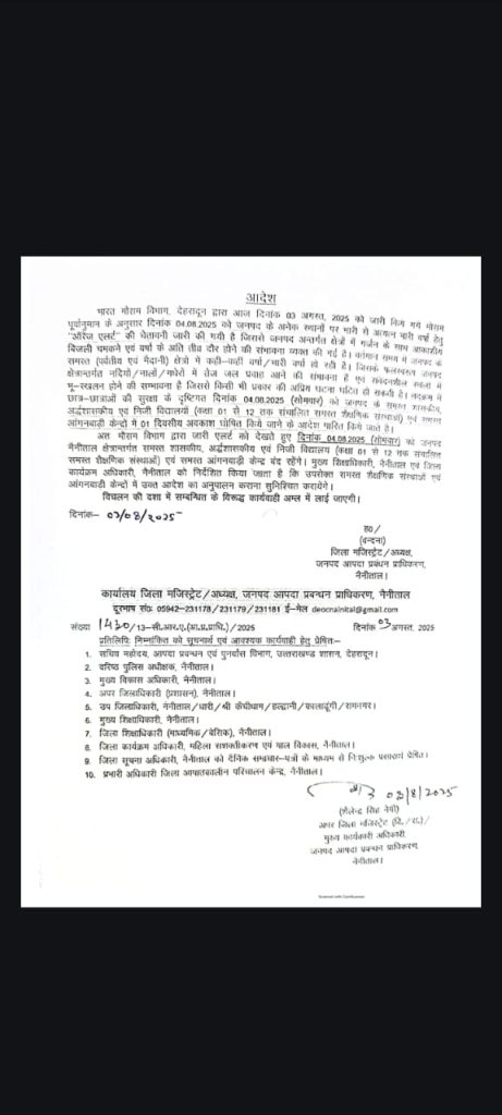 नैनीताल। सरोवर नगरी व उसके आसपास मूसलाधार बारिश के चलते तथा जगह जगह ग्रामीण सड़के बन्द हो जाने एवं पहाड़ो से मलुवा आने का सिलसिला जारी है। उसके मध्यनजर रखते हुए जिला अधिकारी वंदना सिंह ने 4 अगस्त 2025 को सभी स्कूलों में व आंगनबाड़ी केंद्रों में अवकाश घोषित कर दिया है।