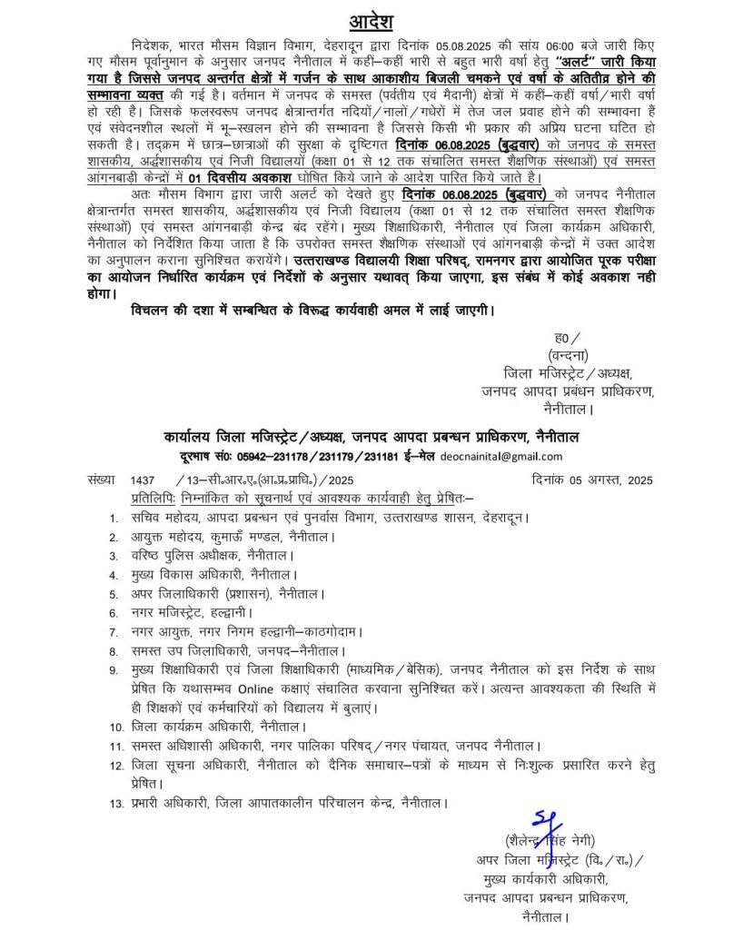 नैनीताल। सरोवर नगरी नैनीताल व उसके आसपास भयंकर बारिश व सड़को के बन्द हो जाने से नैनीताल जिले में कल बुधवार 6 अगस्त को भारी बारिश के चलते स्कूलों और आंगनबाड़ी केंद्रों में अवकाश घोषित, जिला व पुलिस प्रशासन सतर्क। बे वजह न जाये इधर उधर।